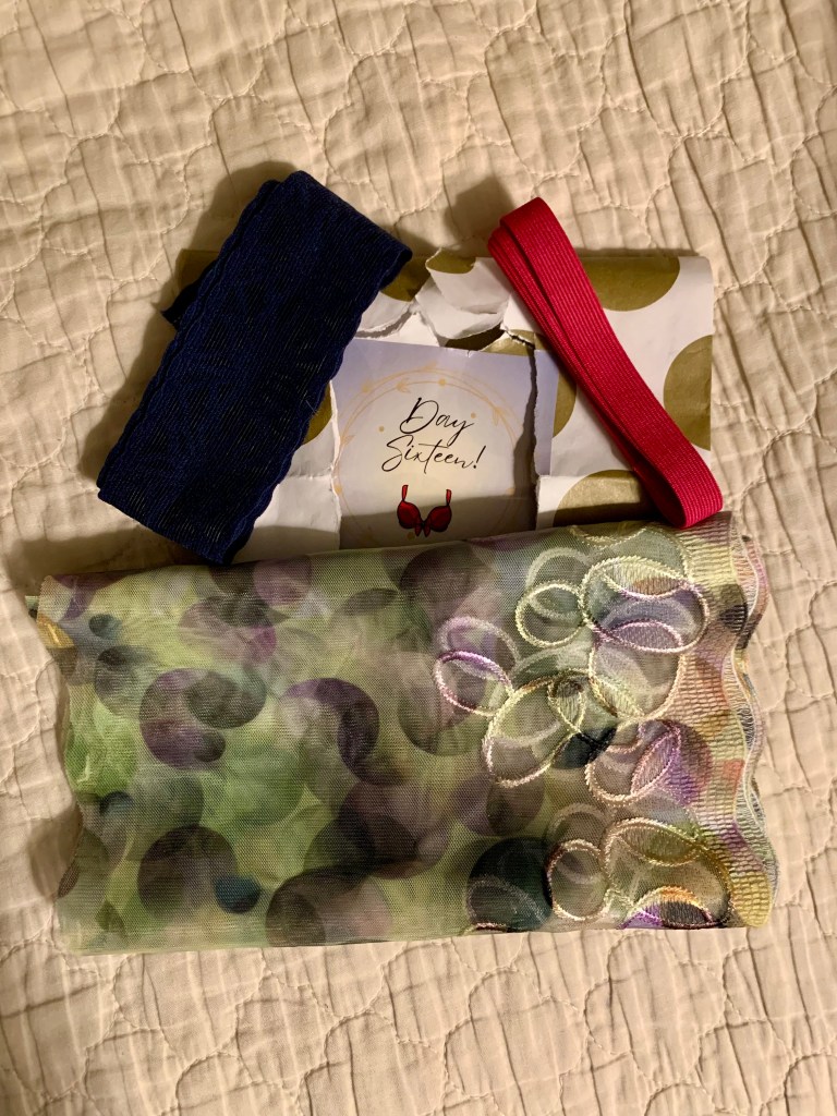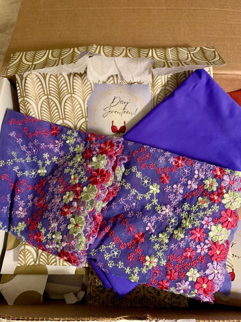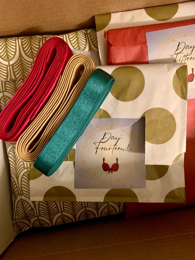 Since I’ve fallen down the bra sewing rabbit hole, I’ve started following Bra Builders to see what new supplies and kits they have on offer each month. While I was checking out the November kits, I saw that they had a BRAdvent box. I always loved doing advent calendars as a kid, and I knew I would be able to use bra supplies one way or another, so it seemed like a fun splurge for the holidays.
