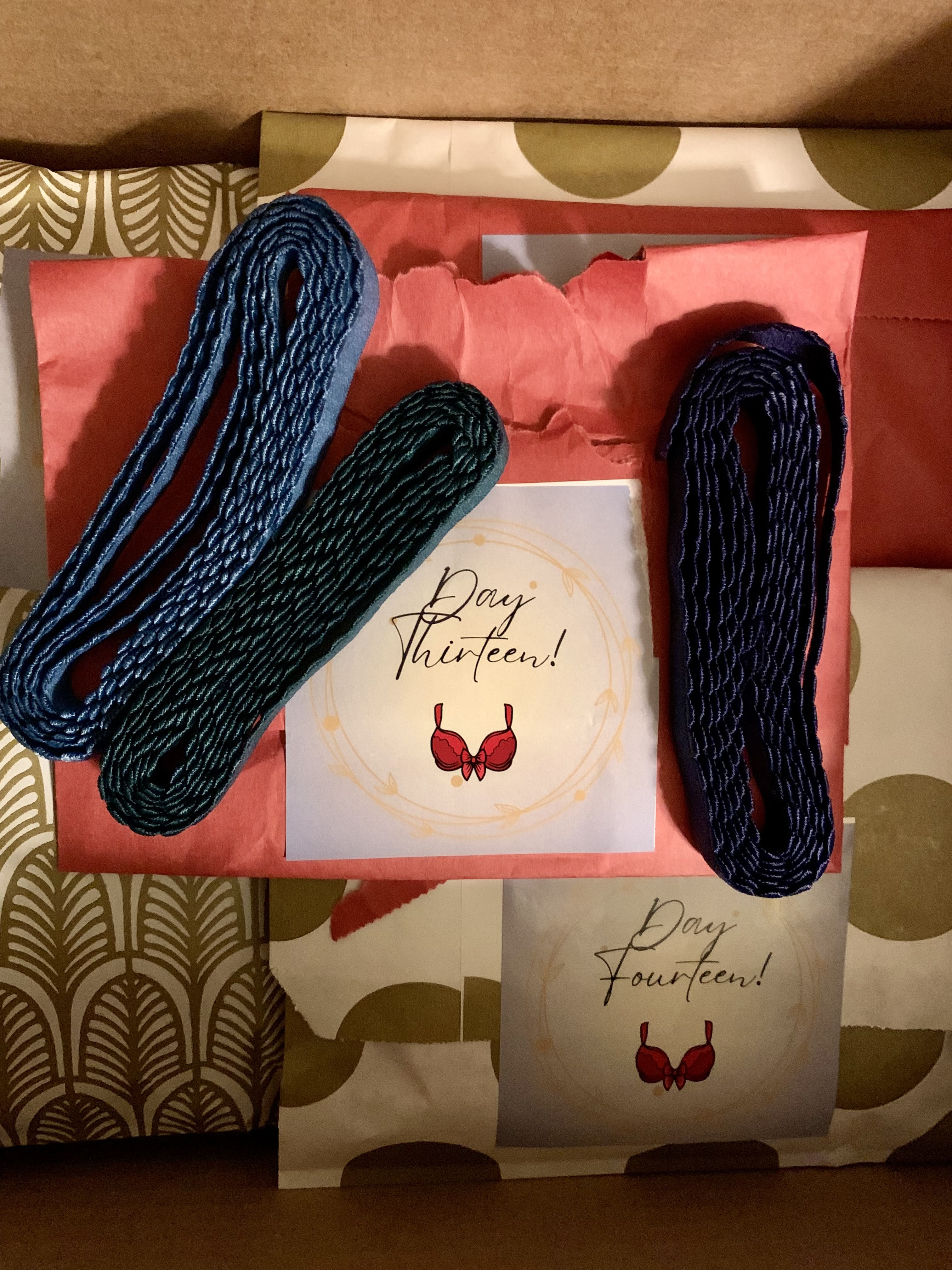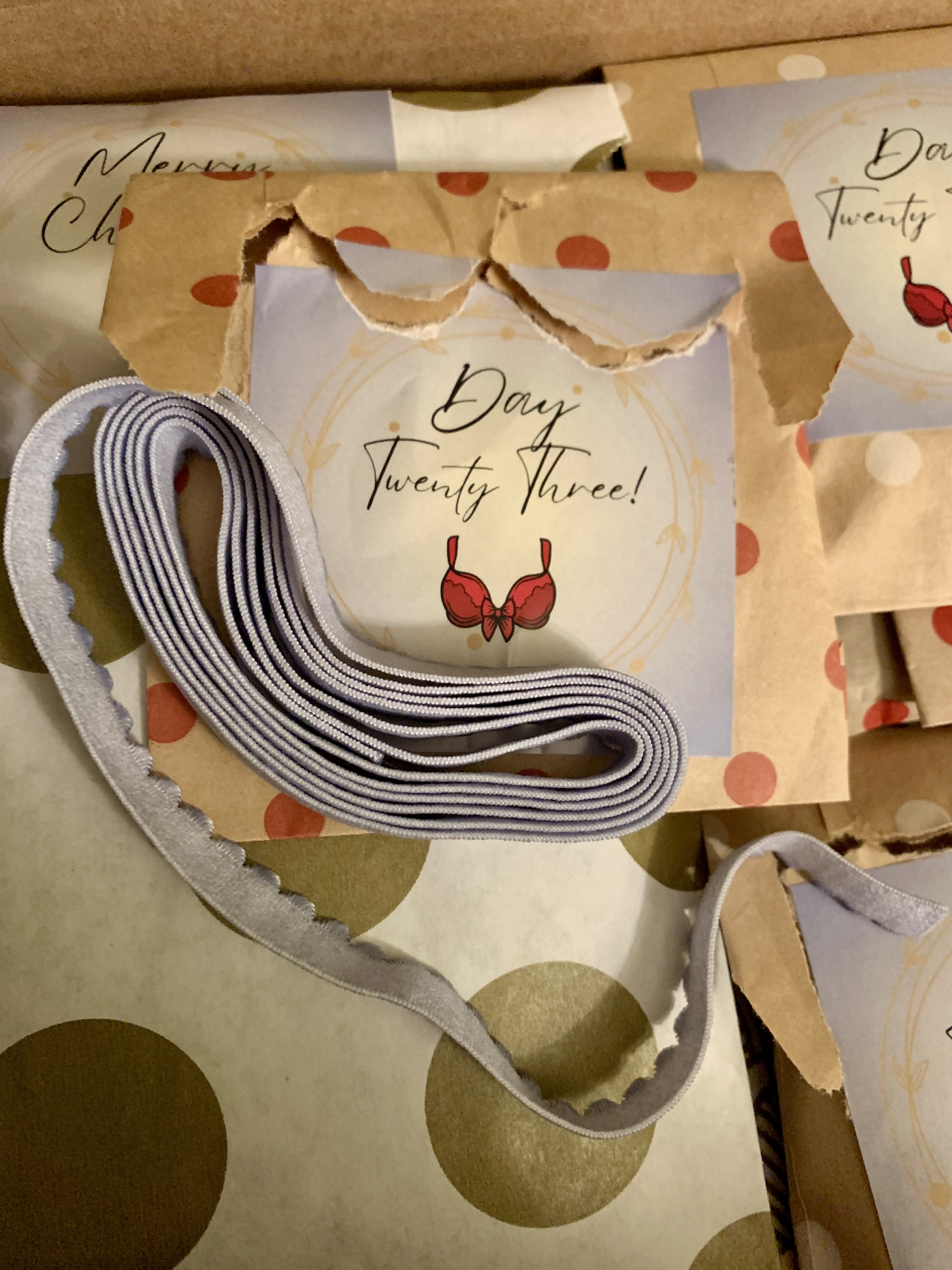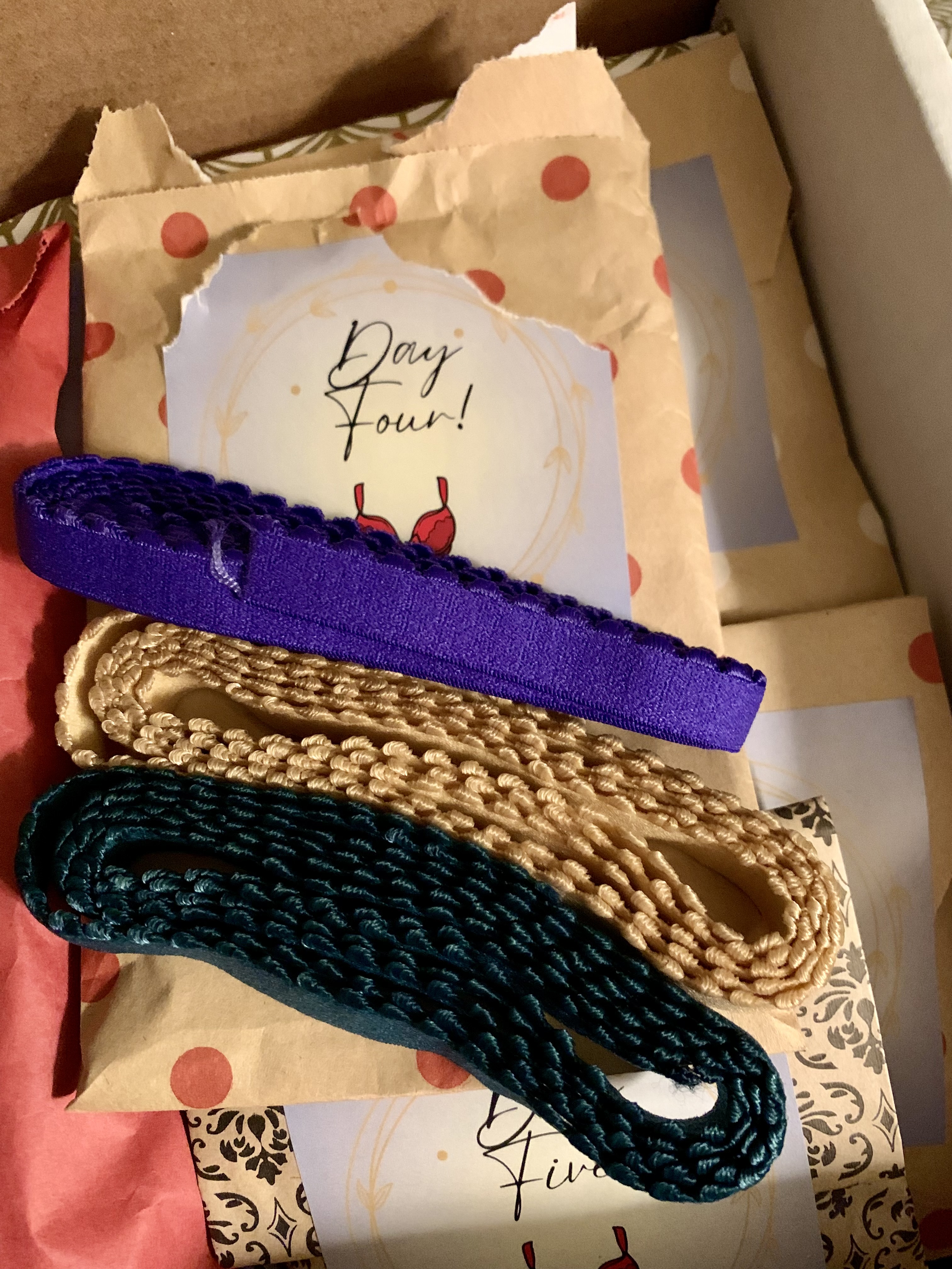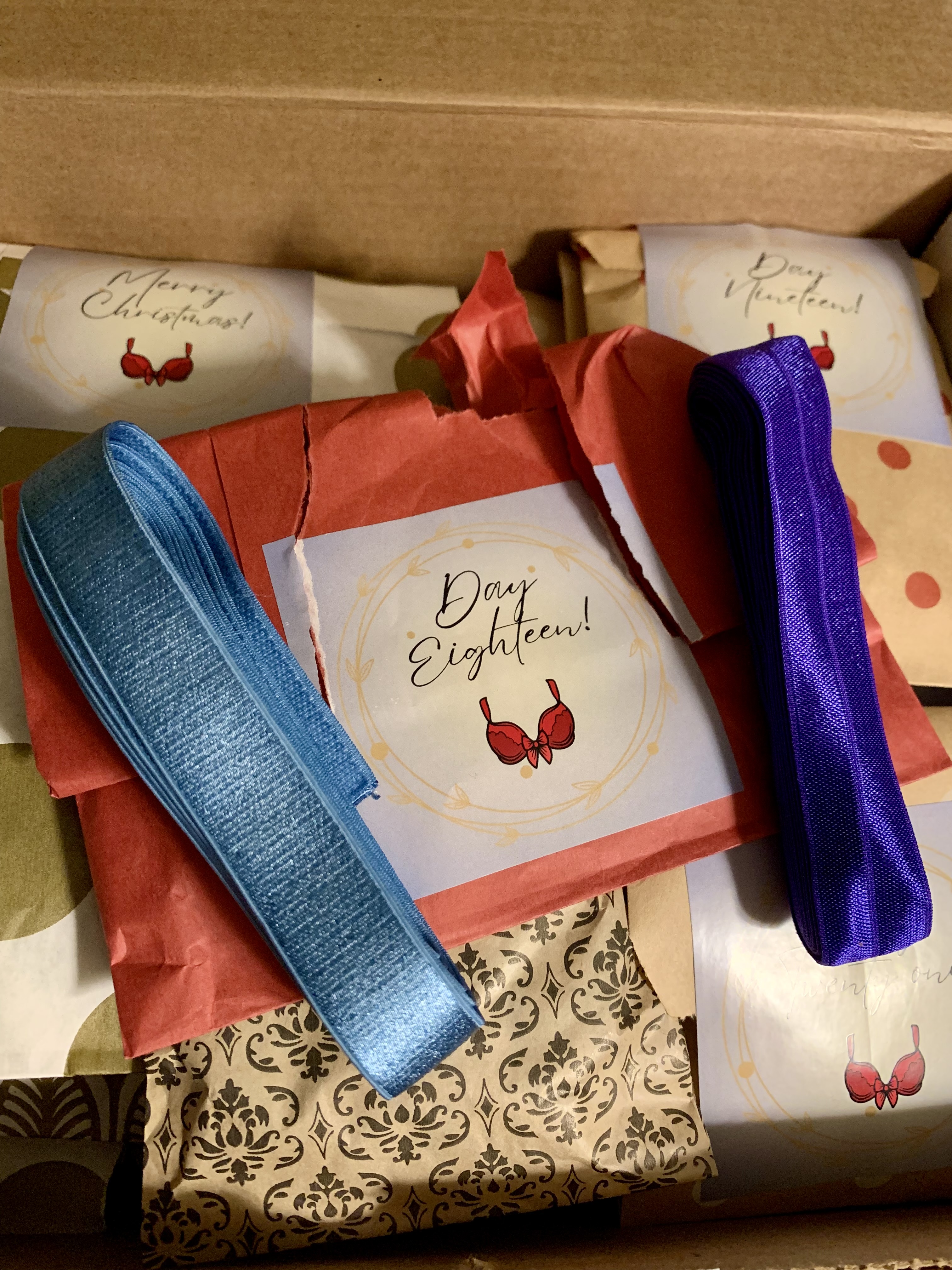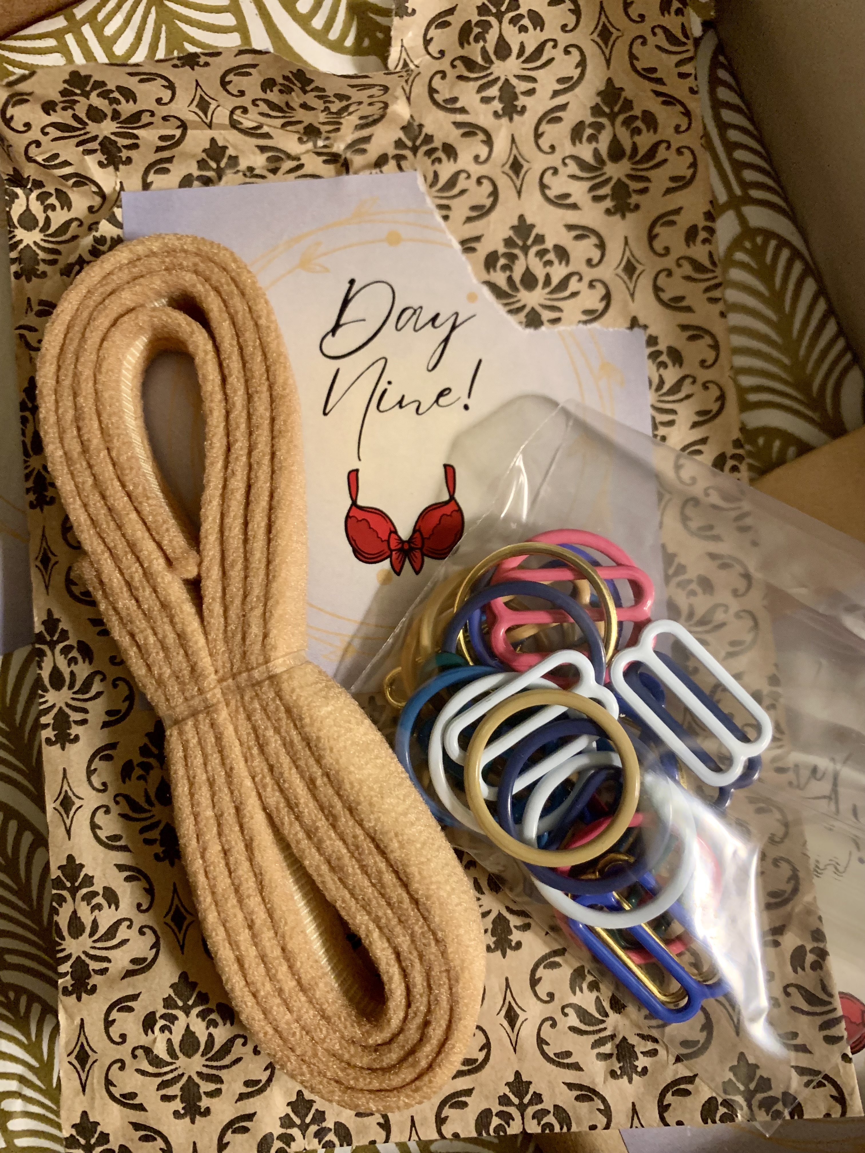Since I’ve fallen down the bra sewing rabbit hole, I’ve started following Bra Builders to see what new supplies and kits they have on offer each month. While I was checking out the November kits, I saw that they had a BRAdvent box. I always loved doing advent calendars as a kid, and I knew I would be able to use bra supplies one way or another, so it seemed like a fun splurge for the holidays.