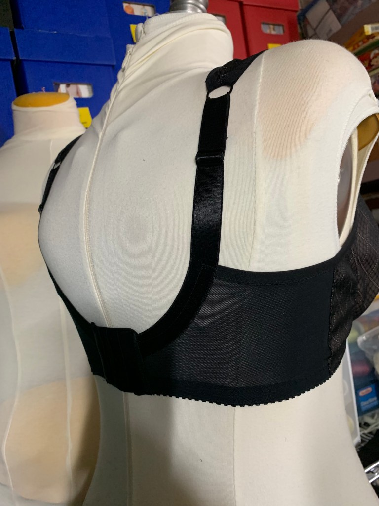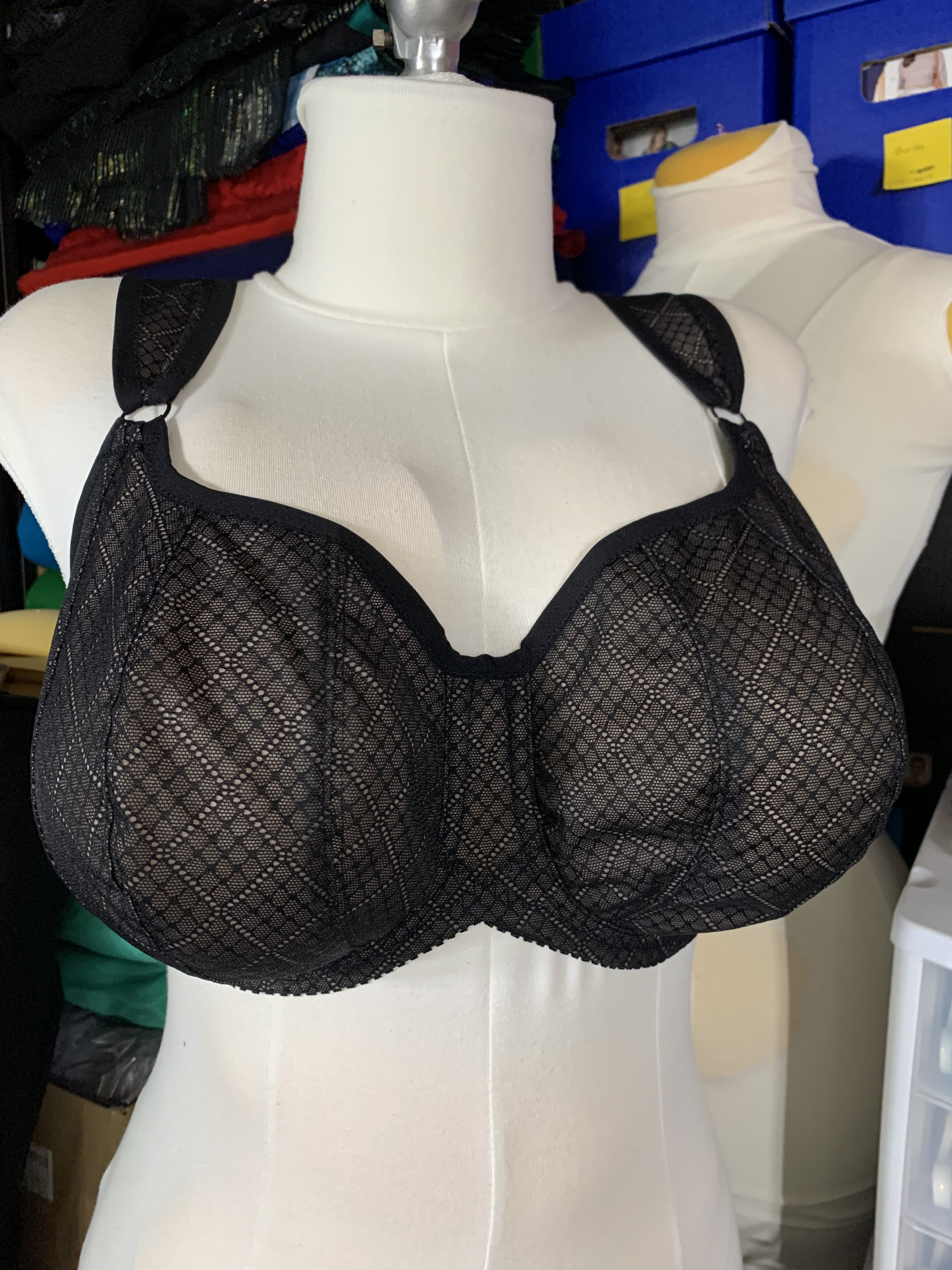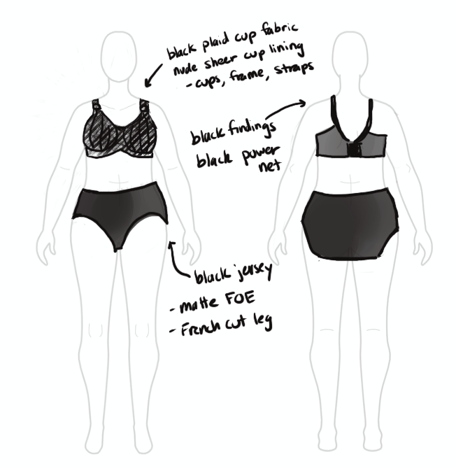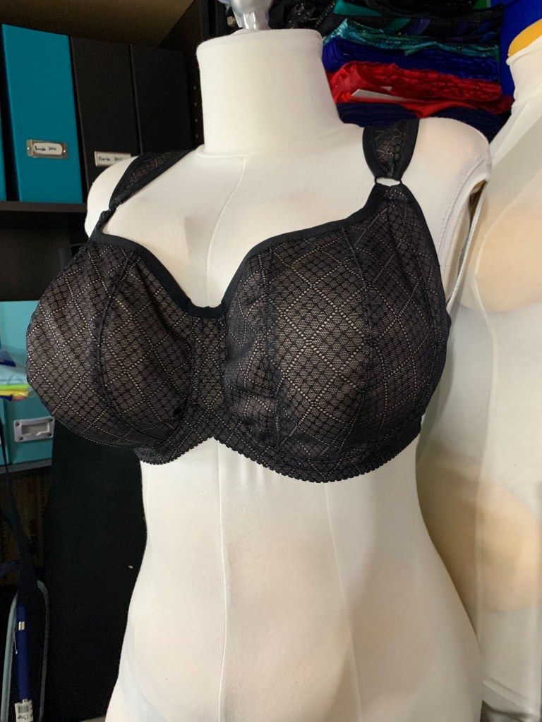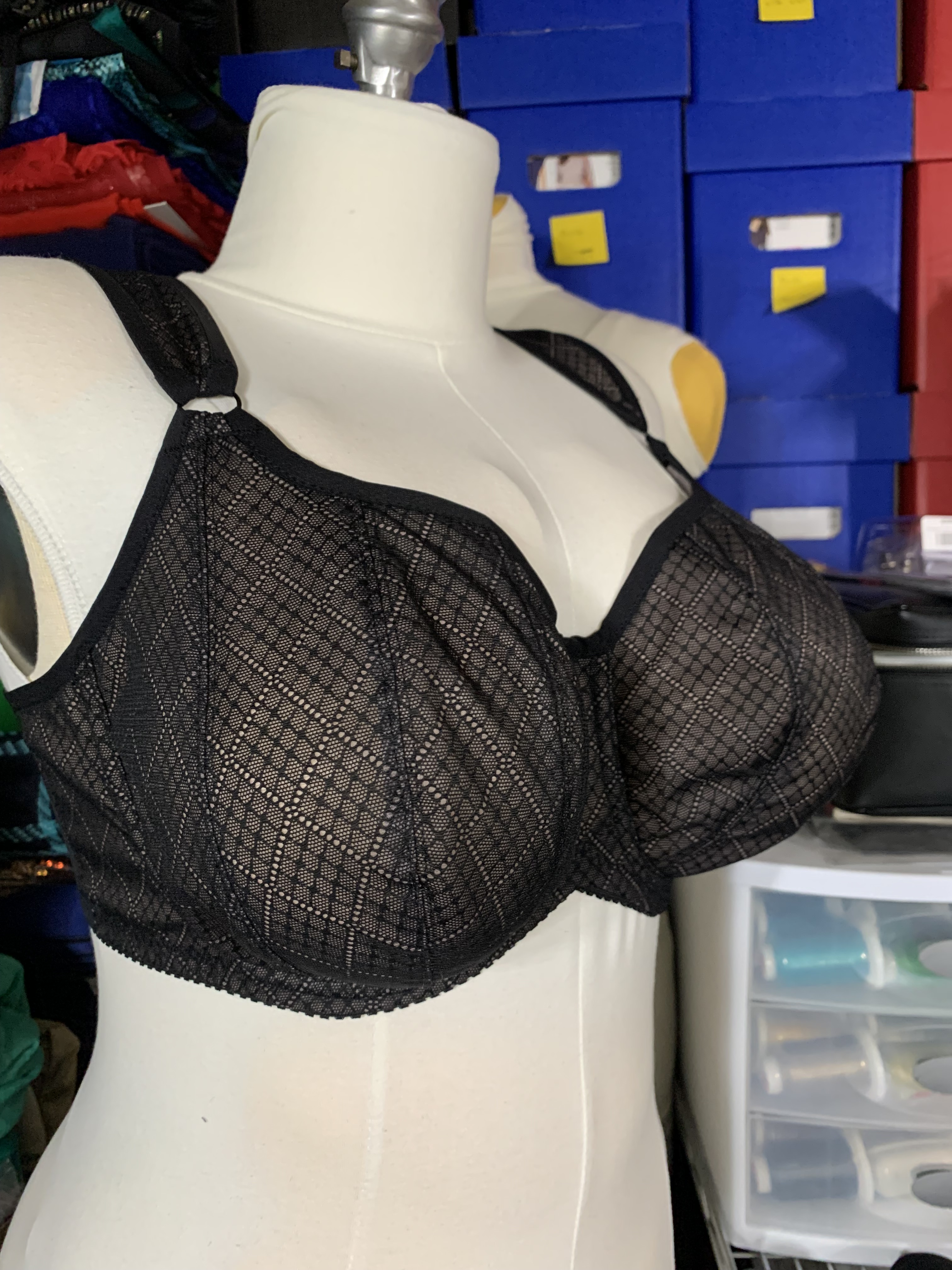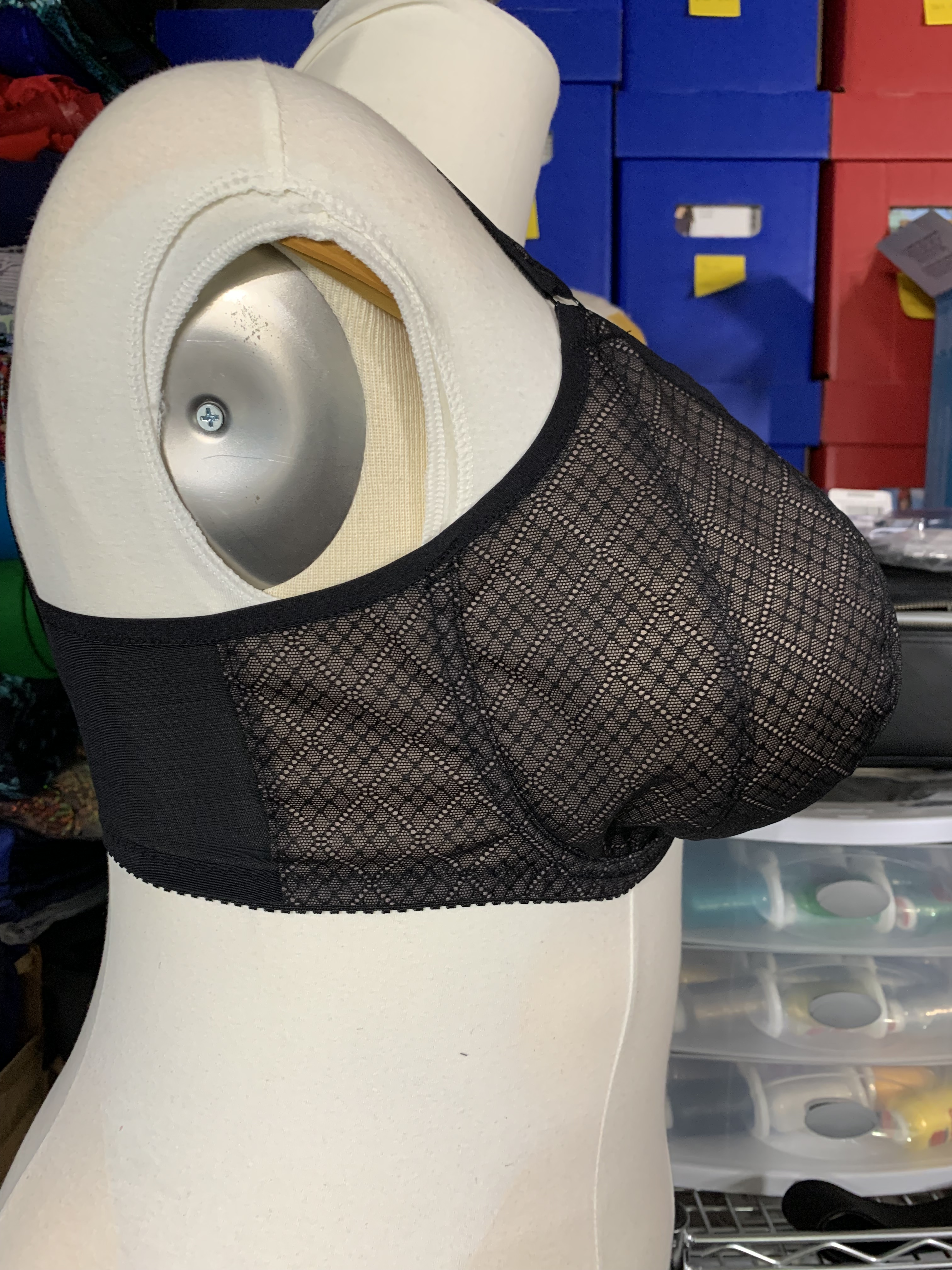 Pattern alterations or design changes you made: I blended the 90A and 90E cup sizes to get a starting pattern. After that I added about 3/4” of height to the top of the center cup piece and tapered down to the innermost point of the cup and to the strap attachment point. For the front band I blended my self-drafted band with some of the pattern style lines to get the same style. For style changes, I used fold over elastic to finish the top edges, and I used a gothic arch to finish the lower band. I also grabbed the curved strap pattern piece from my Sahaara bra pattern to cut the straps because I have found that I prefer mixing a stable strap with the elastic and not using an entirely elasticated strap as is shown on the pattern.