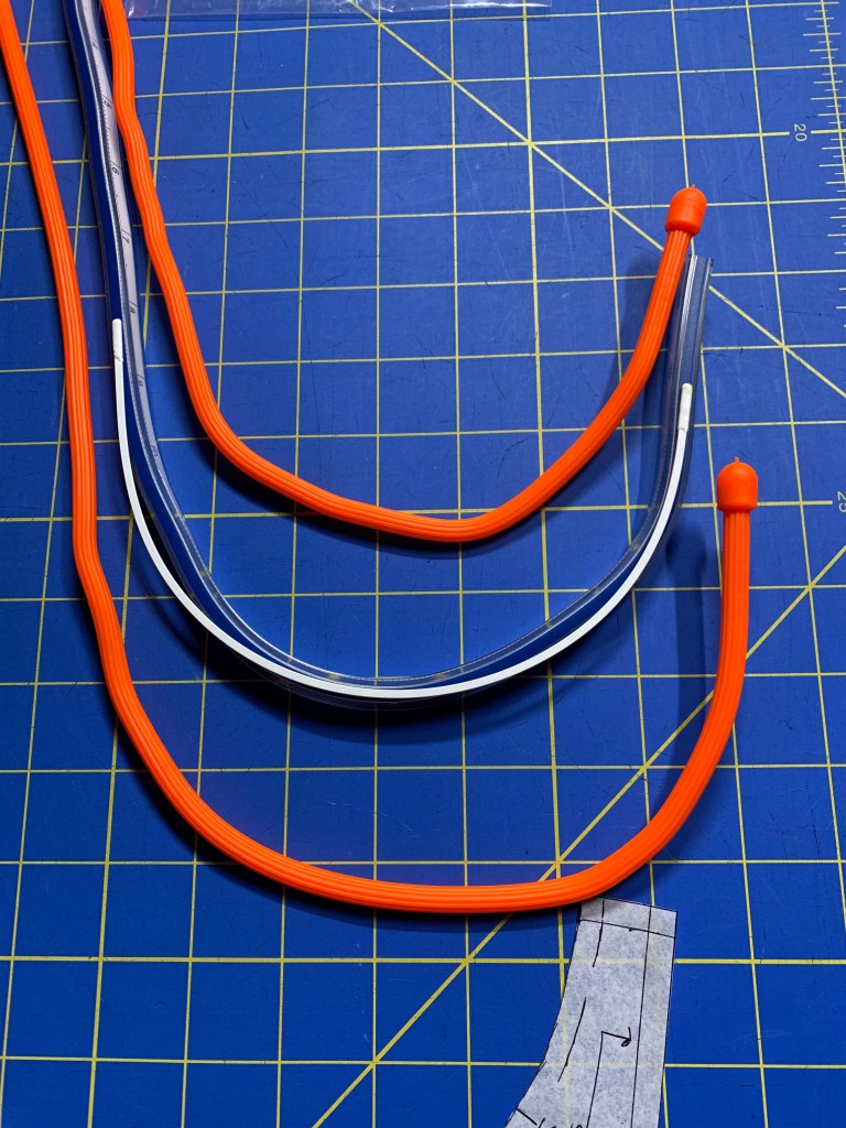 With the BRT in hand, it’s time to look for wires. This is where it can be helpful to start identifying different vendors and downloading wire charts. Some of the vendors I have used in the past are Emerald Erin, Gigi’s Bra Supply, Bra Builders, Bra Makers Supply, Porcelynne, and B,Wear. Make sure to print out the wire charts at 100% scale so that you can compare your sculpted wire BRT to the charts. All vendors will offer wires in different sizes, and most also offer wires in different styles. Depending on the styles of wire and where they are sourced and manufactured, they can have large or small differences between brands. Some of the more common wire styles are Regular, Long, Extra Long, Vertical, and Demi. I have also seen some specialty wires such as Vertical Extra Long, Wide/Flat Bottomed, and Omega, which have some unique shaping to the wires. Some wires have very specific uses (for example, demi style wires would be used for a demi style bra and would not typically be used with a full coverage bra), but some styles can be utilized in different ways, depending on the person. For example, I tend to prefer a vertical wire in my everyday bras, but for others this style is often recommended for strapless bra styles because it offers extra height on the side of the wire compared to a typical regular or “day” style of wire. In addition to the wire shape and size, the wire’s material can also impact fit. Most wires are rigid wires with a fairly standard wire gauge, but Porcelynne offers a heavier gauge of wire and Bra Builders offers a flexible wire option. During fitting, it is advised to use a rigid wire so the fitting band will maintain its shape, so I will continue this article with the assumption that a rigid wire is being utilized, but I will say that many people prefer to use a flexible wire for daily wear after fitting because it can bend into a more comfortable body-hugging formation.
