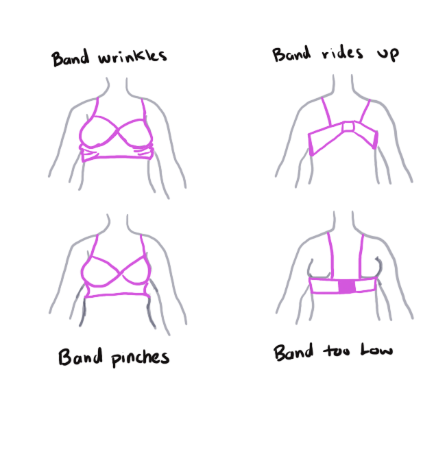 Most of the support in a bra comes from the fit of the frame and band, so checking the fit of this part of the bra is critical to a good result. Because there are so many possible fit issues with the band, there is quite a list of things to check for when assessing band fit: