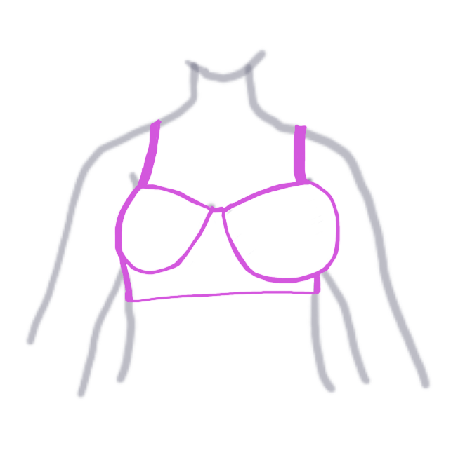 Once the basic fit of the band has been reviewed, the next important area to check is the bridge, which is the triangular area of fabric that sits between the breasts. Getting the bridge to sit flat against the sternum or “tack” in this area is a key indicator that the fit is correct, and is considered a major win for anyone who sews their own bras. Most bridge shapes can be classified as “narrow high triangles” or “short wide triangles” so once you figure out your body structure it can help a lot in assessing a pattern even before starting the fitting process. When assessing the fit of the bridge, here are some things to look for: