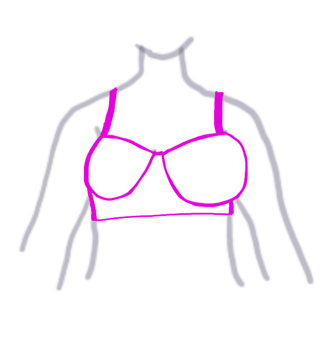 Once the basic fit of the band has been reviewed, the next important area to check is the bridge, which is the triangular area of fabric that sits between the breasts. Getting the bridge to sit flat against the sternum or “tack” in this area is a key indicator that the fit is correct, and is considered a major win for anyone who sews their own bras. Most bridge shapes can be classified as “narrow high triangles” or “short wide triangles” so once you figure out your body structure it can help a lot in assessing a pattern even before starting the fitting process. When assessing the fit of the bridge, here are some things to look for: