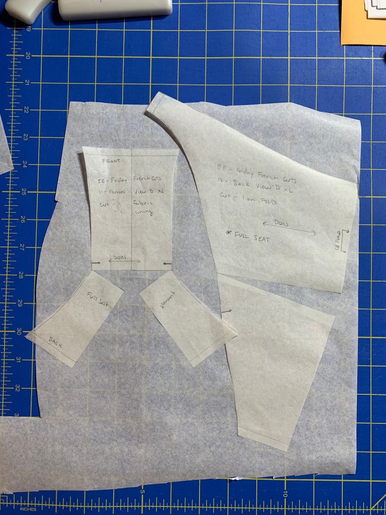 Anyway, after making my first Friday French Cuts I decided I really didn’t want to deal with the just barely but not quite wide enough back, so I did a full bum adjustment by slashing and spreading to create a wider back gusset seam. Measuring the difference from where the pattern was and where I wanted it to be, I added 2″ to the back gusset seam.