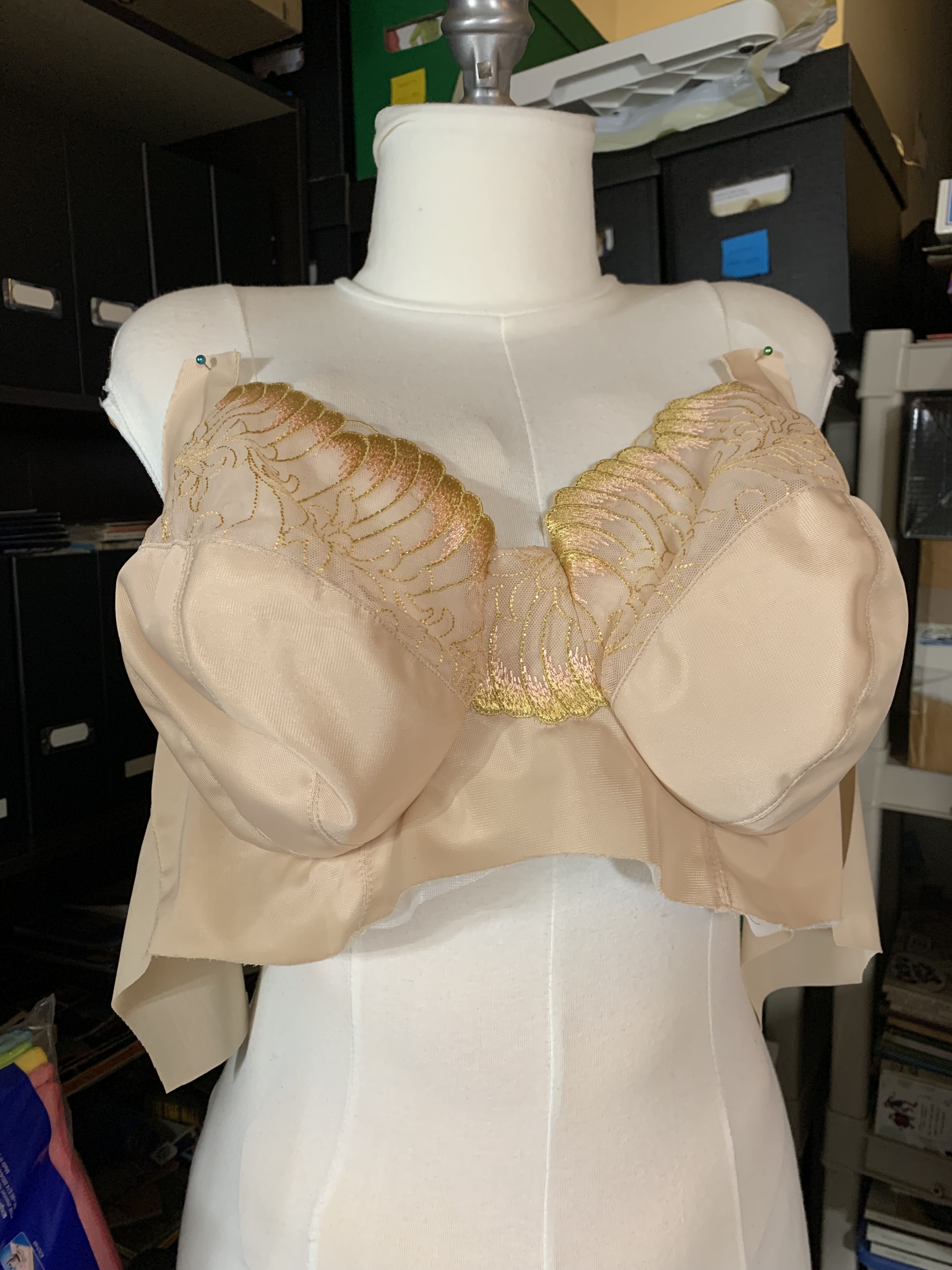 Last month I started working on a pair of beige Josey’s in the hopes that I could (1) test out adjustments to the band patterns and a new self-drafted band with more wire spring (in depth post coming soon) and (2) have some beige bras to wear over the summer. Unfortunately, I was so busy for much of July that they were languishing in this half-sewn but elastic-less state for most of the month: