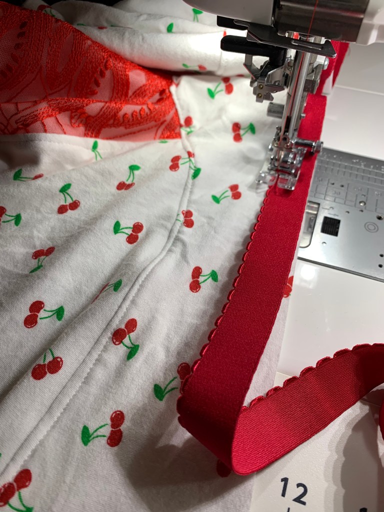 Of course, since I was buying the cherry fabric by the yard and not in a kit cut, I had a lot more of it than I needed for a since bralette project. So I started working on what will probably end up being the start of a very robust cherry lingerie mini wardrobe. Since I already have several underwear patterns worked out, I started with two of those – the Bravo Bottoms #2 and my self-drafted Craftsy Class panties. Since I was working from stash and not from a kit, I pulled out some of my fancy wide elastics for the waistbands. I really like the wide daisy elastic from Bra Builder because it’s very robust in the wash. I’m going to have to see how my more delicate lacy elastic turns out after use, but it is super cute!