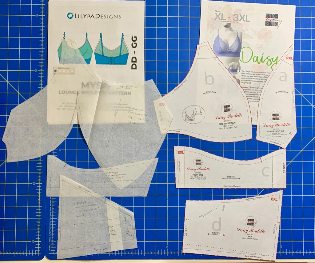 As I’ve gotten into sewing undergarments, I’ve really been enjoying testing different patterns and working on getting a great fit. I’ve also been sewing (and wearing!) a lot more wireless bras because I’ve been curious about the patterns and construction. One of the patterns I really liked the style of was the Stitch Love Studio Daisy Bralette, but the fit just wasn’t quite right for me. I’d had much better luck fitting the Mysa, which is similar in the band style, but different in the cups (a two-piece vertical seam vs. a one-piece dart). Although I probably could have taken the time to fit the Daisy, I decided it would just be easier to change the style lines of the Mysa to get a better fit. So I split the cup along the dart and straightened out the front cup edge to mimic the look of the Daisy, but using the extended sizing of the Mysa.