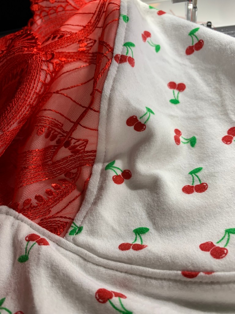 It’s really funny that before I started sewing undergarments I really couldn’t have cared less about if things matched or how they looked. If they “fit” and were functional, it was fine. I also really wasn’t into cutesy undergarments or frilly things with lots of lace. However, when I saw this adorable cherry fabric in a Metro Textiles email advertisement I became a bit obsessed. I tried to talk myself out of it but I kept coming back to look at it and had to get some. I knew it wasn’t the sort of print I’d ever wear as an outer garment (if cutesy undergarments weren’t my thing, cutesy regular clothes definitely weren’t either), so I hatched a plan to make an entire Lingerie Mini-Wardrobe. Wow. Matching and cutesy? How the tides have turned…