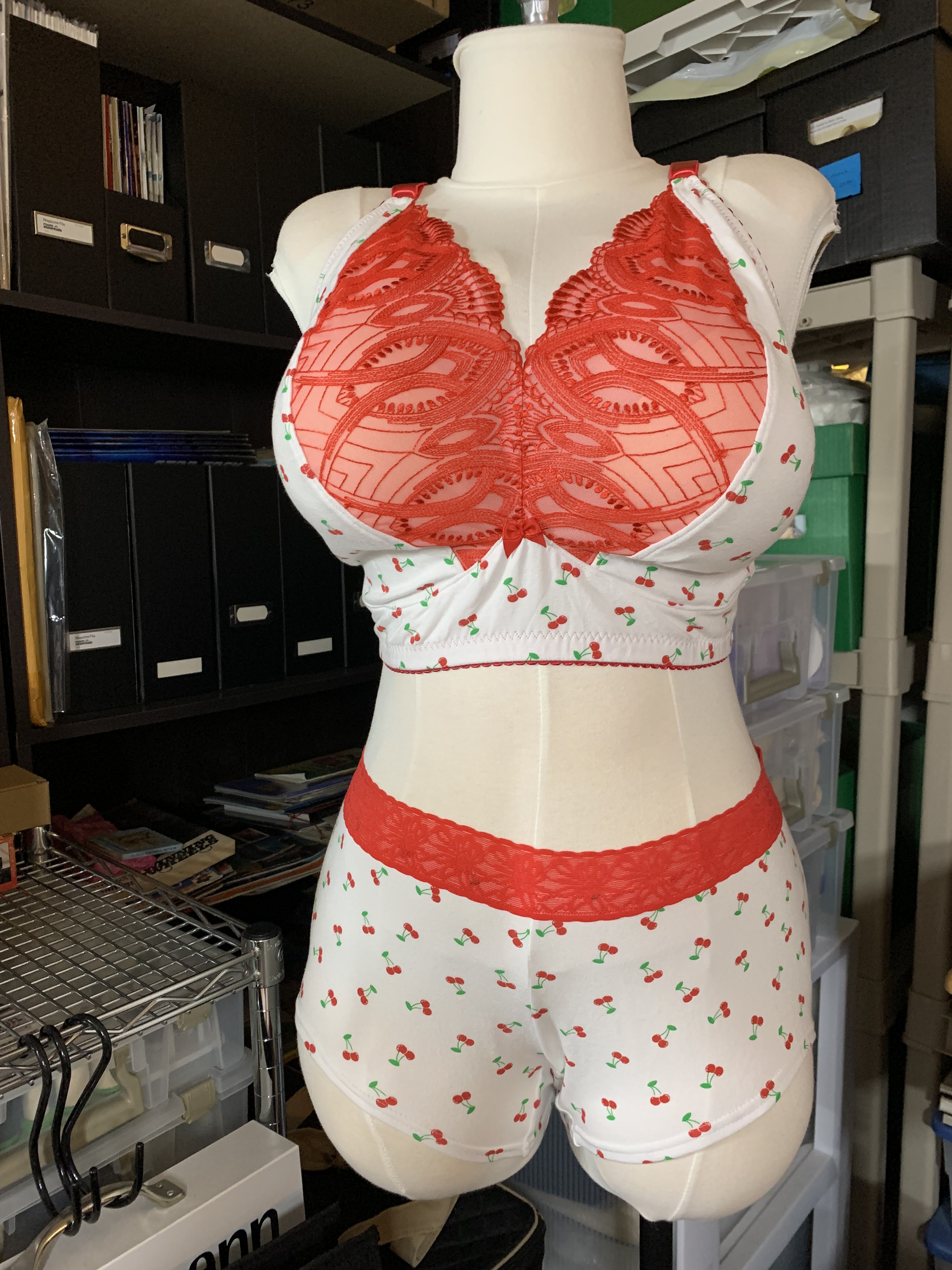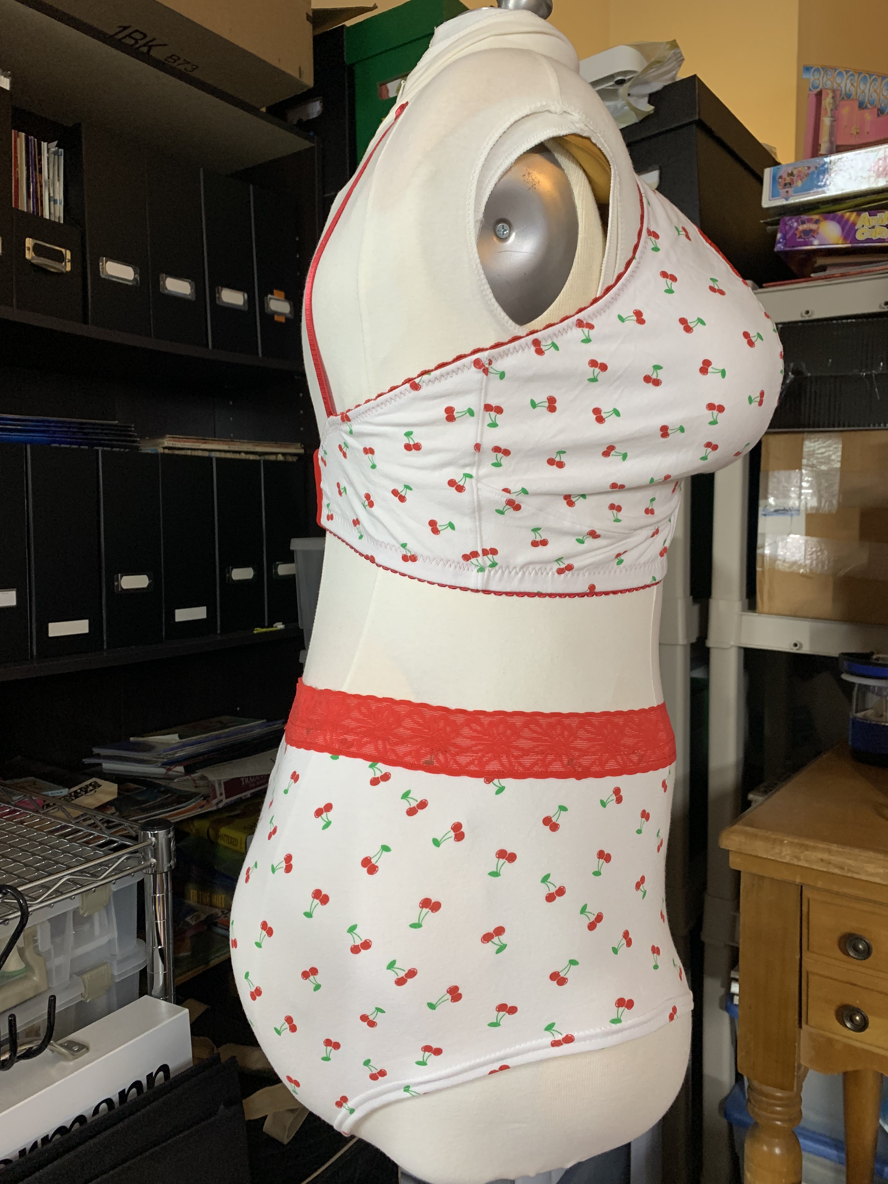 Of course, since I was buying the cherry fabric by the yard and not in a kit cut, I had a lot more of it than I needed for a since bralette project. So I started working on what will probably end up being the start of a very robust cherry lingerie mini wardrobe. Since I already have several underwear patterns worked out, I started with two of those – the Bravo Bottoms #2 and my self-drafted Craftsy Class panties. Since I was working from stash and not from a kit, I pulled out some of my fancy wide elastics for the waistbands. I really like the wide daisy elastic from Bra Builder because it’s very robust in the wash. I’m going to have to see how my more delicate lacy elastic turns out after use, but it is super cute!