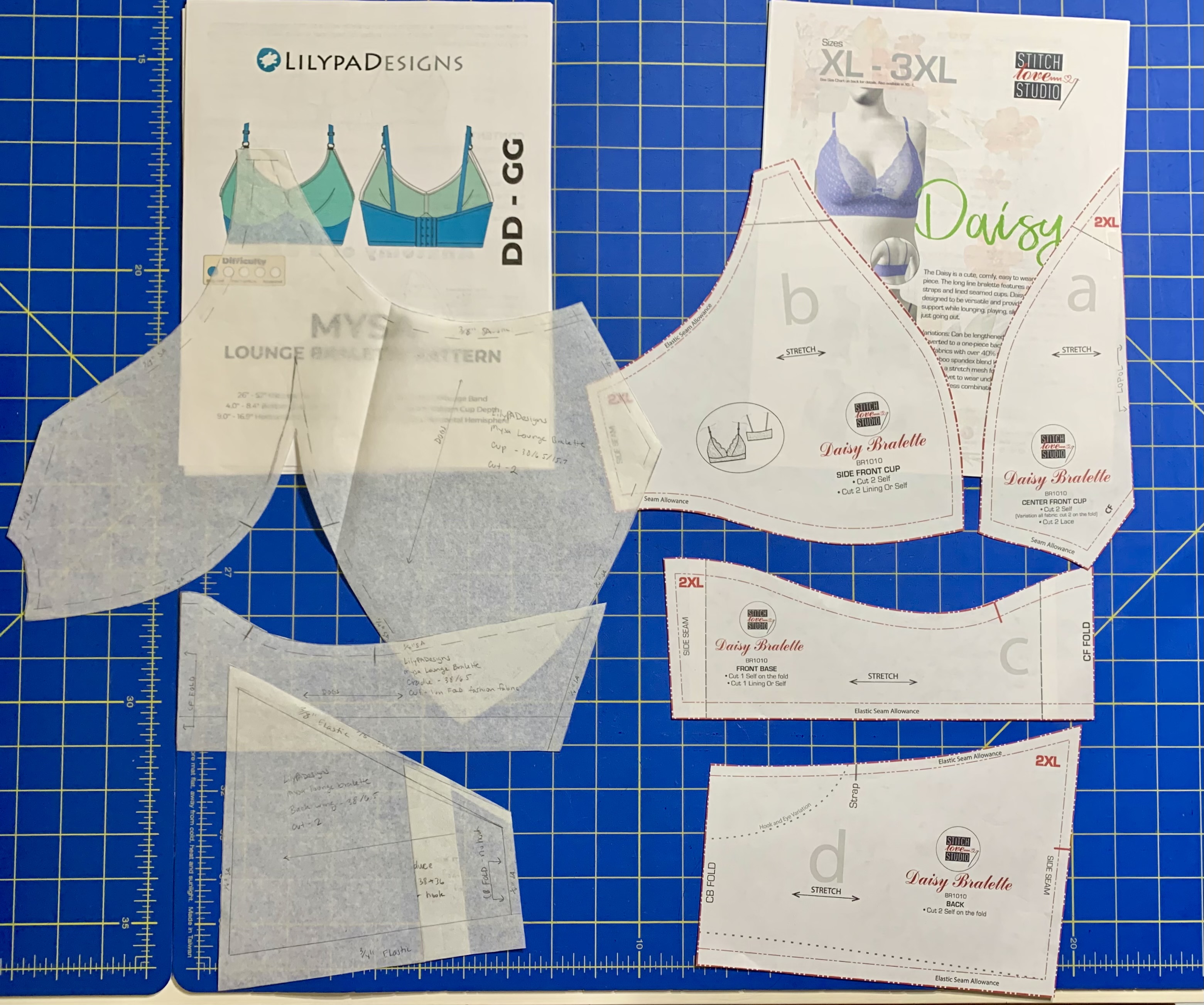 As I’ve gotten into sewing undergarments, I’ve really been enjoying testing different patterns and working on getting a great fit. I’ve also been sewing (and wearing!) a lot more wireless bras because I’ve been curious about the patterns and construction. One of the patterns I really liked the style of was the Stitch Love Studio Daisy Bralette, but the fit just wasn’t quite right for me. I’d had much better luck fitting the Mysa, which is similar in the band style, but different in the cups (a two-piece vertical seam vs. a one-piece dart). Although I probably could have taken the time to fit the Daisy, I decided it would just be easier to change the style lines of the Mysa to get a better fit. So I split the cup along the dart and straightened out the front cup edge to mimic the look of the Daisy, but using the extended sizing of the Mysa.