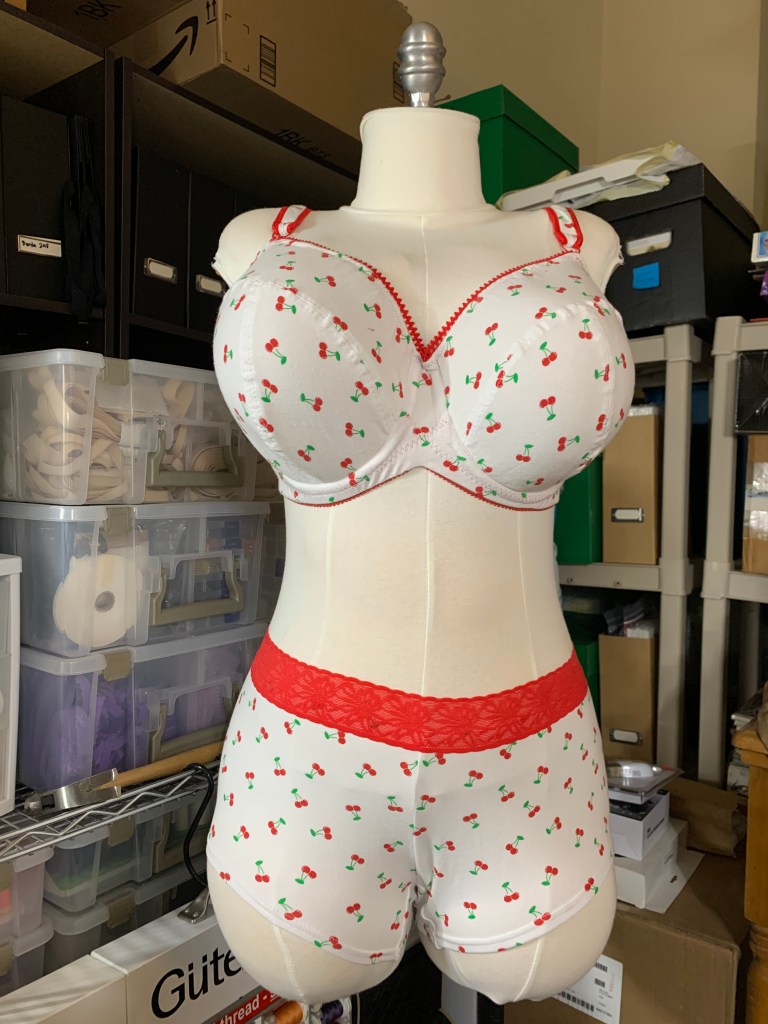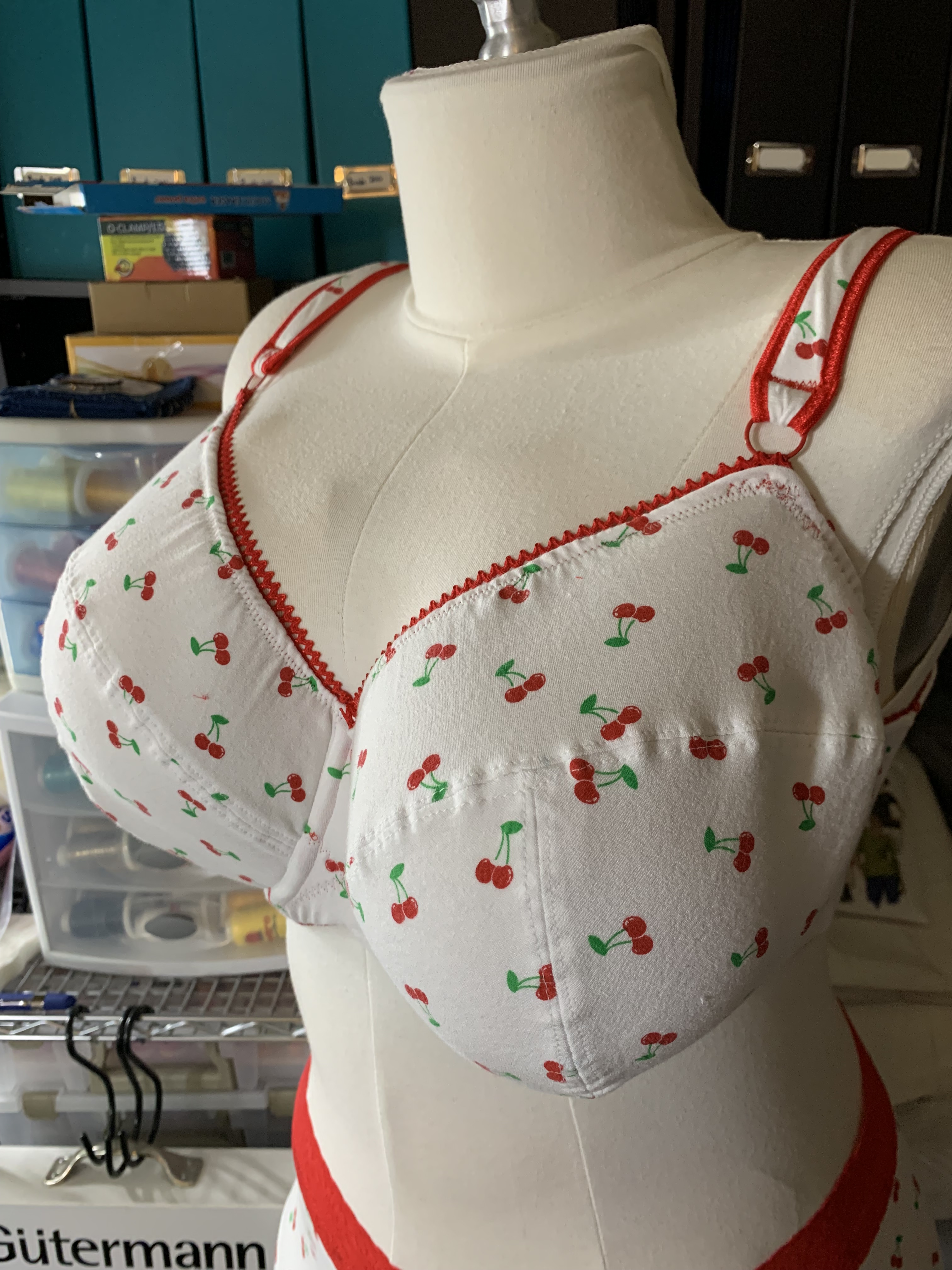 I will say that although adjusting the upper cup did bring me close to the brink in terms of losing my mind, I was able to get a pretty reasonable pattern with only 2 tries on the upper cup. I probably should have done more testing, but I was feeling a bit crunched on time so I decided to just jump in. I also probably should have been smart and made the pattern in sheer cup and duoplex, but since the pattern was designed for a foam cup, I decided to just go all in and make a foam cup bra covered with my cherry jersey fabric from Kashi at Metro Textiles.