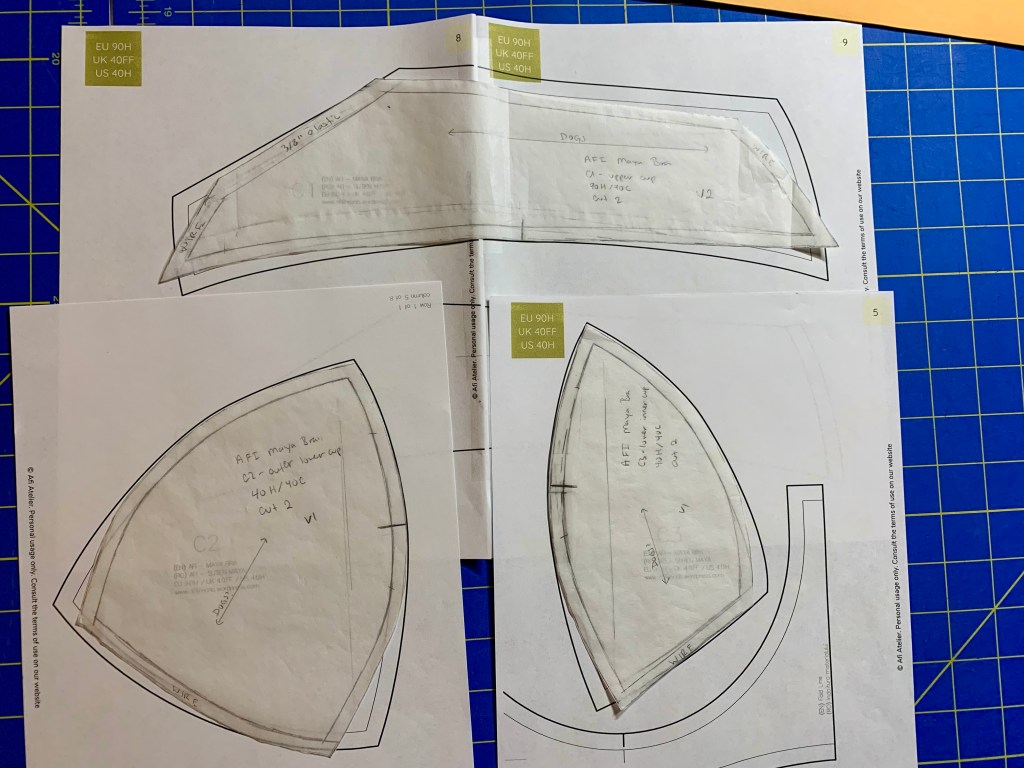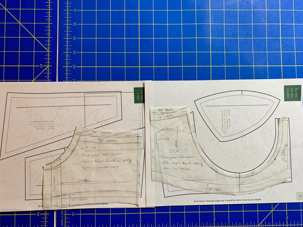 I didn’t have a lot of time to work on this pattern, so I decided to just use my self-drafted band and skip over messing with the band pattern. I did have to make a lot of changes to the cup pattern though and had a fairly sizable omega adjustment to get the pattern to work with my larger volume and smaller wire line. The cup pieces are based on the 40H pattern, but my band most closely resembles the 40C pattern.