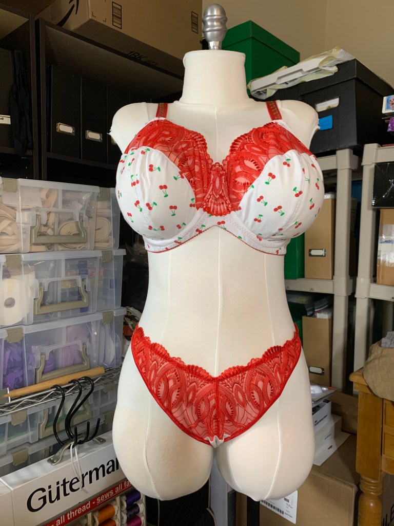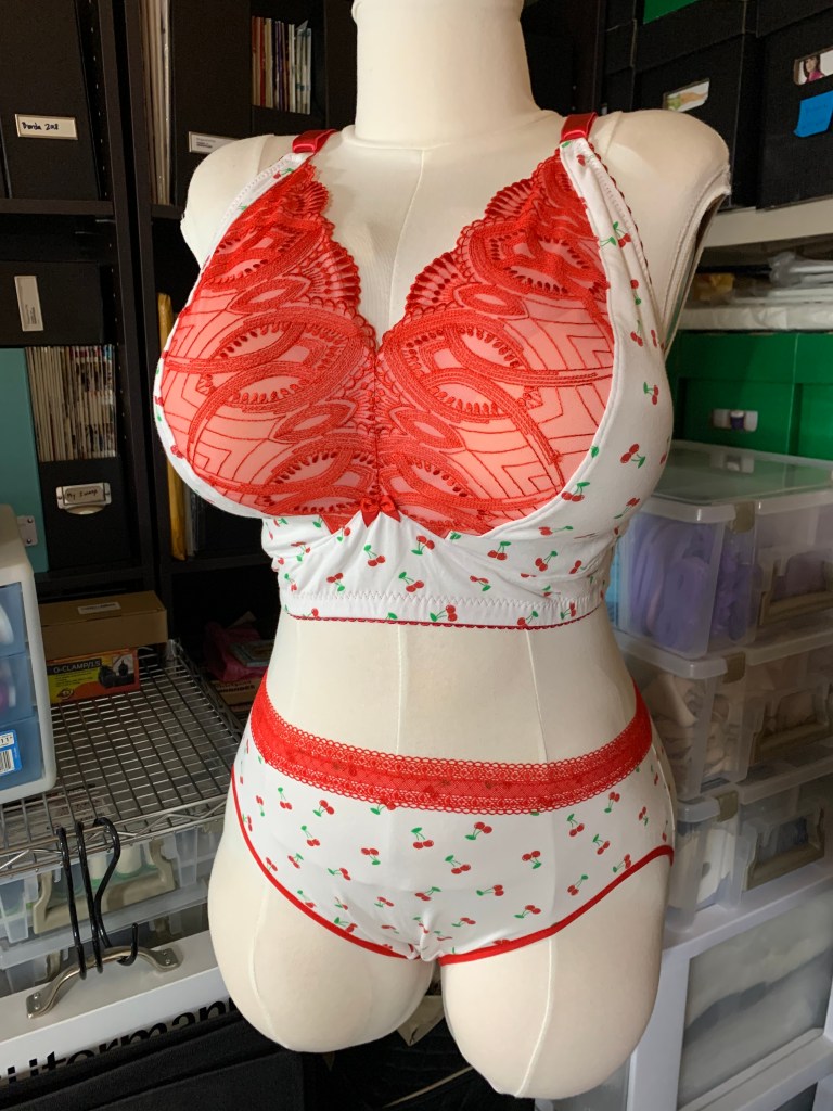 After making plans in my previous post, I didn’t think I would finish these sewing plans so soon, but an unexpected challenge in The Hive set me down the path of testing out the Maya Bra from AFI Atelier, and this resulted in me deciding to just go all in with the cherry fabric while it was top of mind, despite the fact that I have a lot of other things to sew this month. However, since I already had the other patterns ready to go, most of these were quick sews and I have ended up with a mix and match lingerie wardrobe that I’m really happy with!