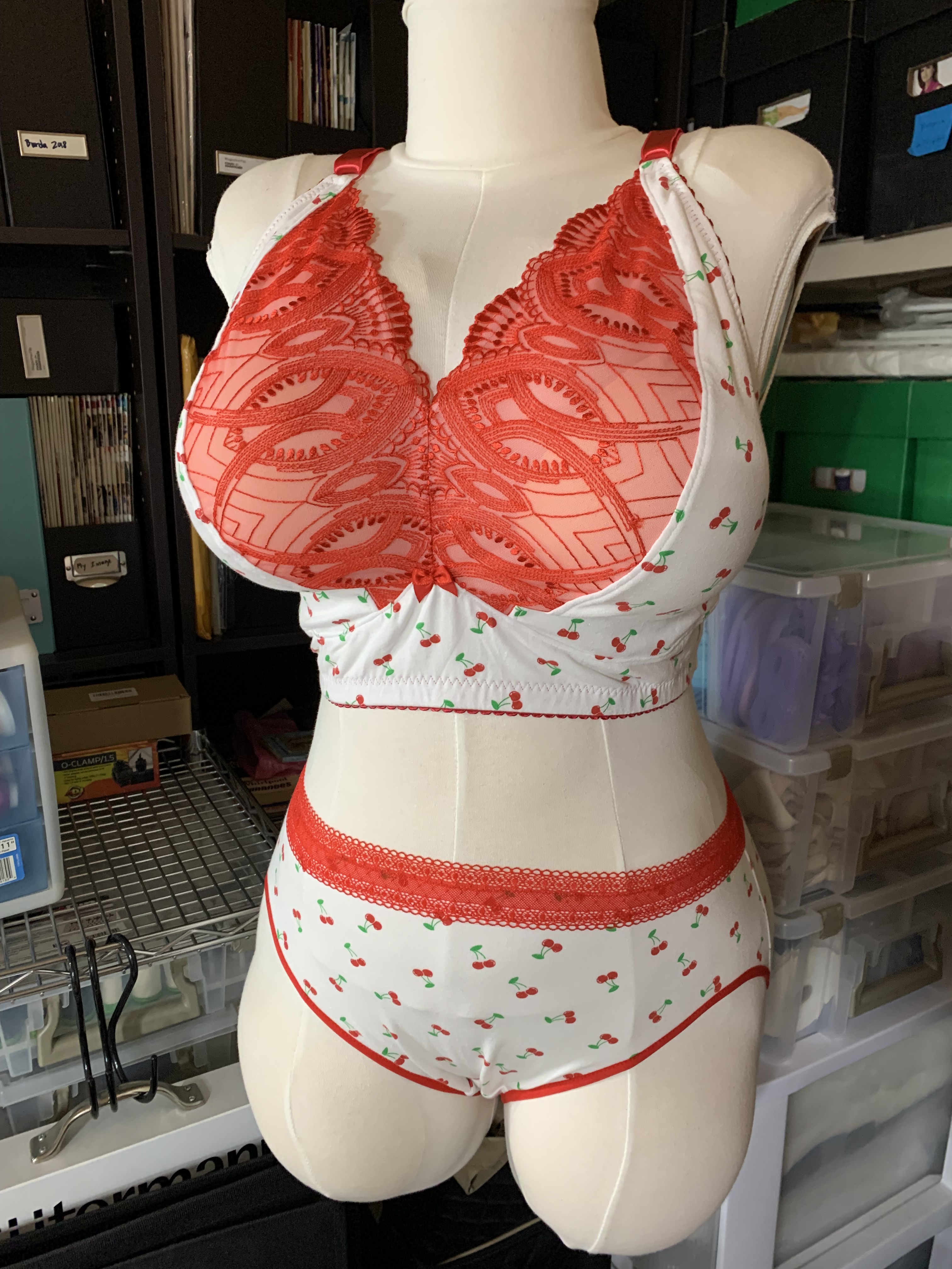 After making plans in my previous post, I didn’t think I would finish these sewing plans so soon, but an unexpected challenge in The Hive set me down the path of testing out the Maya Bra from AFI Atelier, and this resulted in me deciding to just go all in with the cherry fabric while it was top of mind, despite the fact that I have a lot of other things to sew this month. However, since I already had the other patterns ready to go, most of these were quick sews and I have ended up with a mix and match lingerie wardrobe that I’m really happy with!
