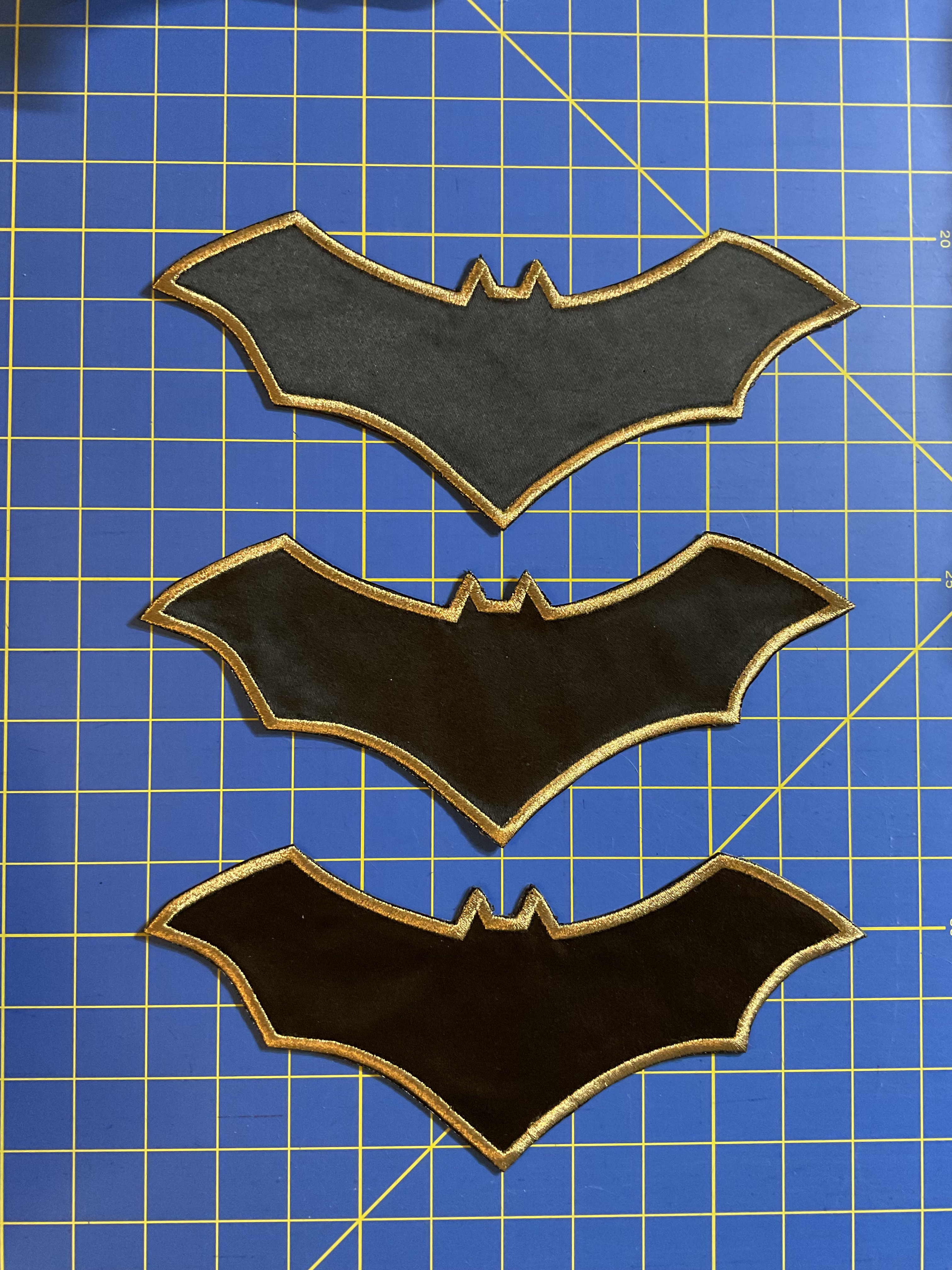 My sister is also making the coolest Halloween costumes! I’ve been giving lots of sewing advice, but she’s done all of the work – I hope she’ll let me post photos so I can brag about it. I did contribute one small piece to the costumes though; I digitized and embroidered a Batman patch for her boyfriend’s costume and sent it to her to attach. (And because we don’t trust metallic thread or me with a hot knife, I made 3… just in case.)