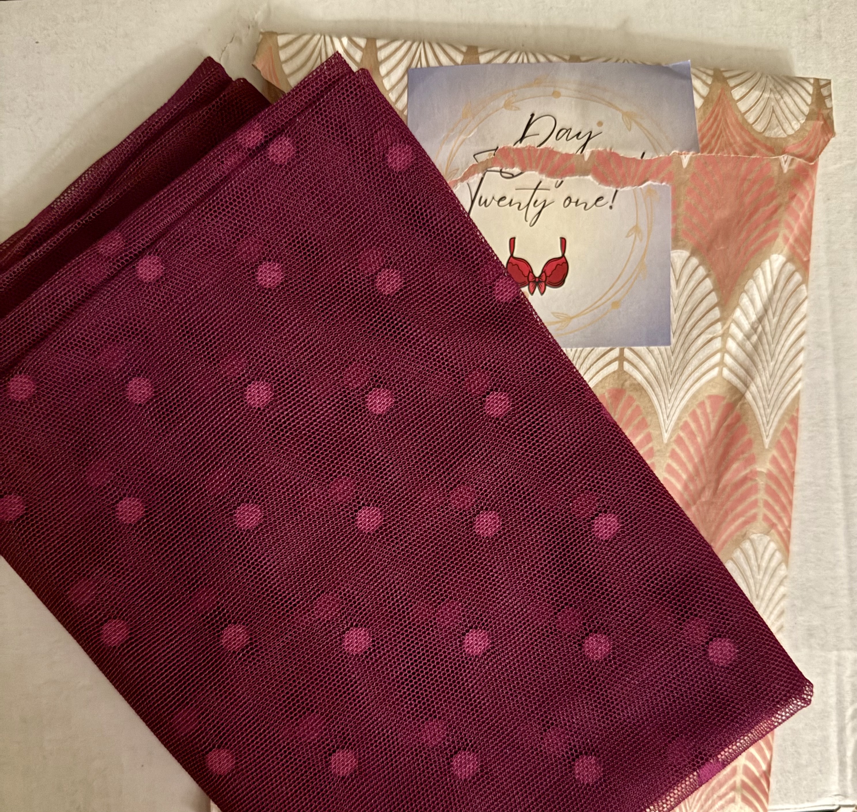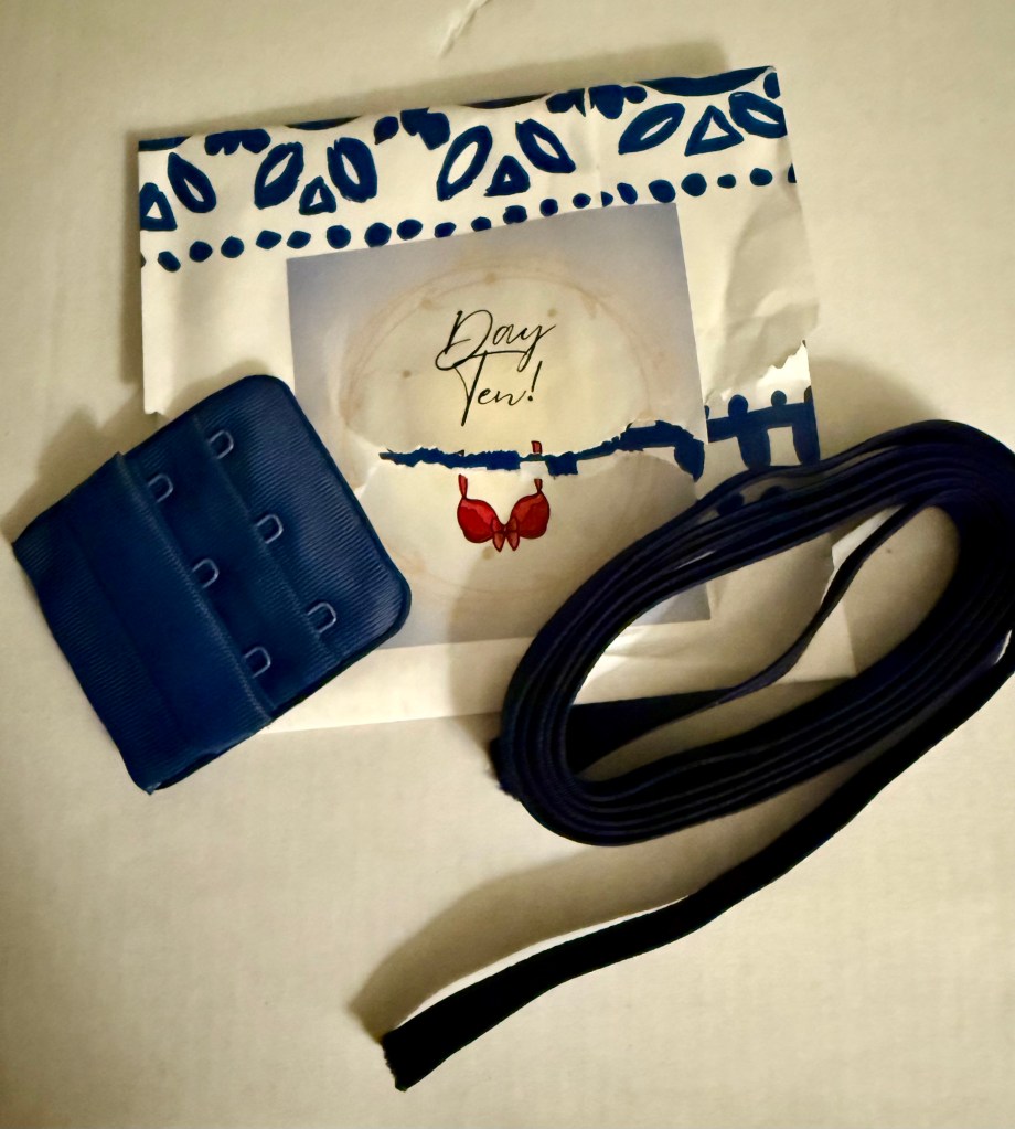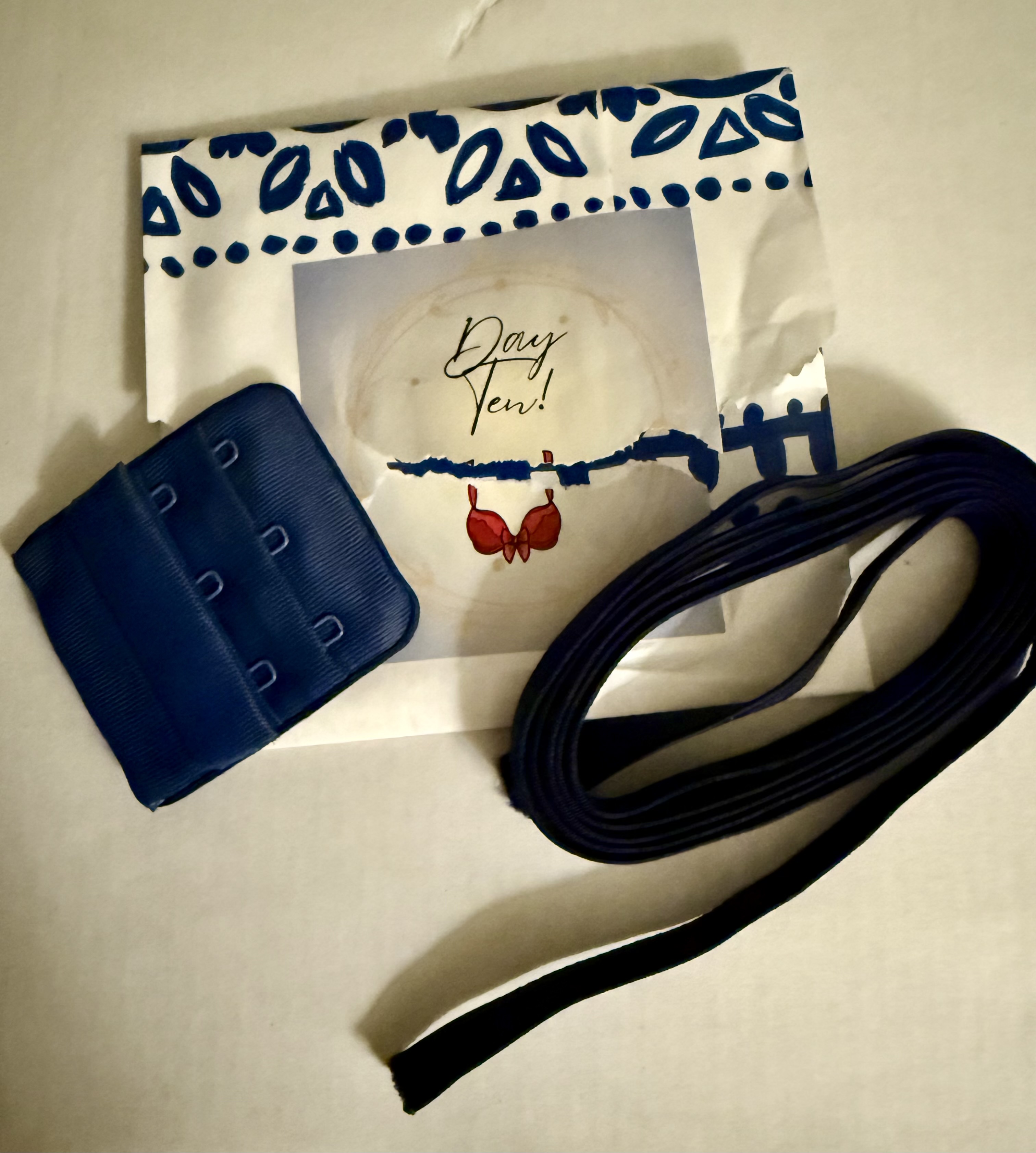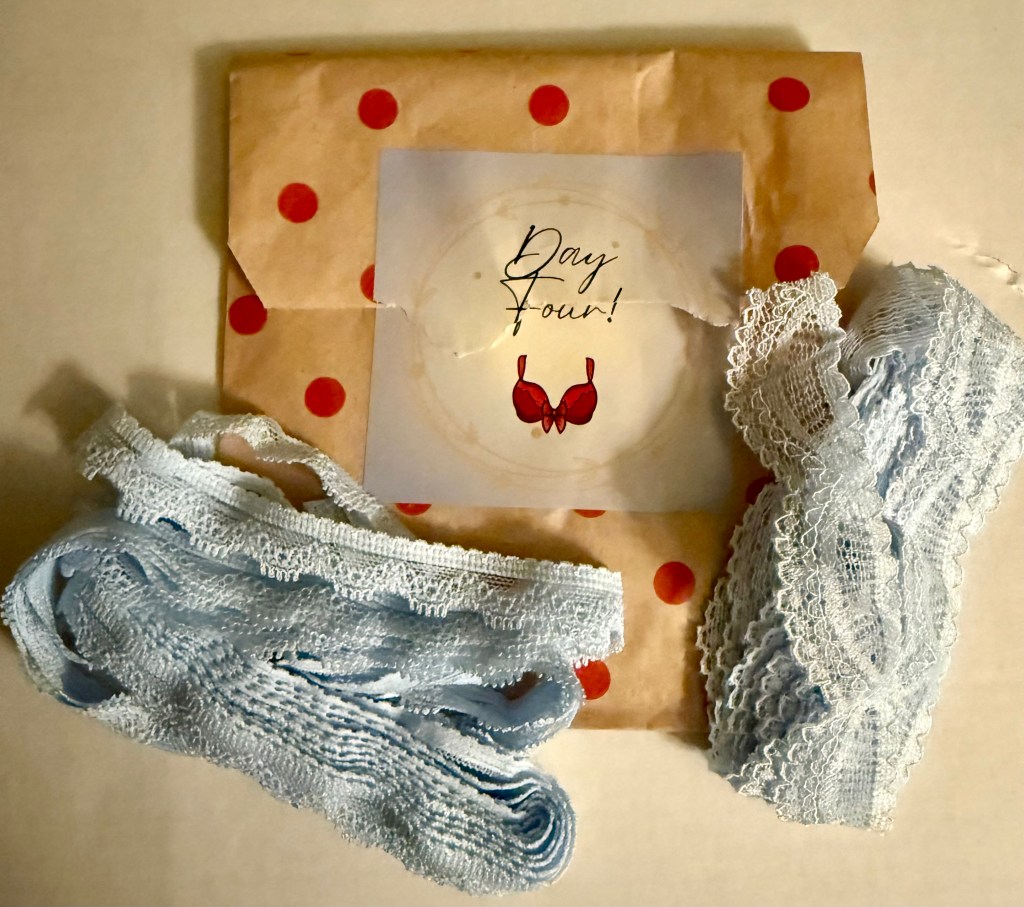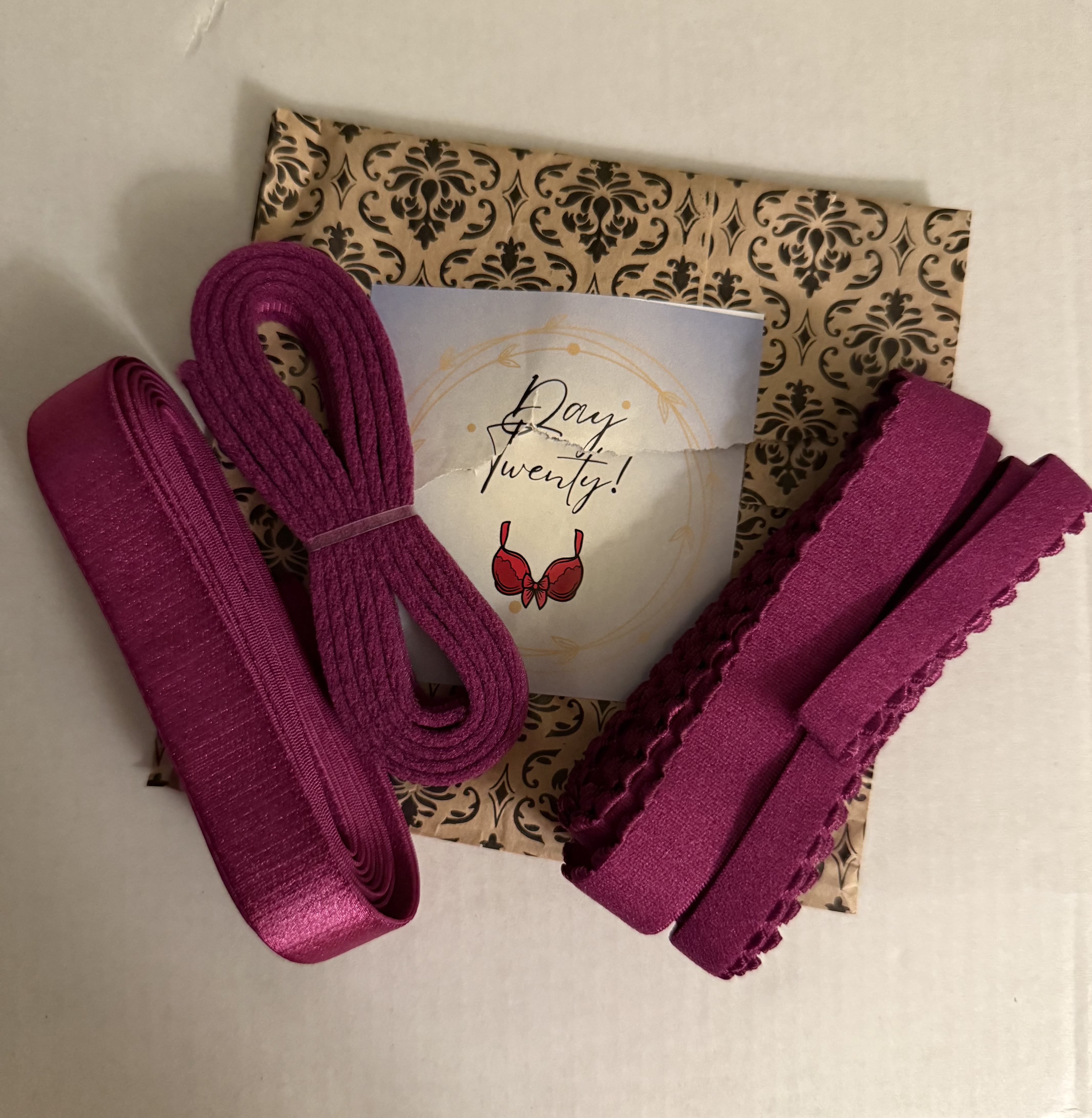Like last year I’ve been doing a daily photo document of my packages, so I’ve got an image of what I got every day, plus an extra picture of the underwires and cotton materials that weren’t in a daily package but were part of the box. I got a mix of many different kinds of elastics and fabrics, from stretch lace and bamboo jersey to microlycra and microduoplex. Here is what I got in my Bra Builders BRAdvent Box this year: