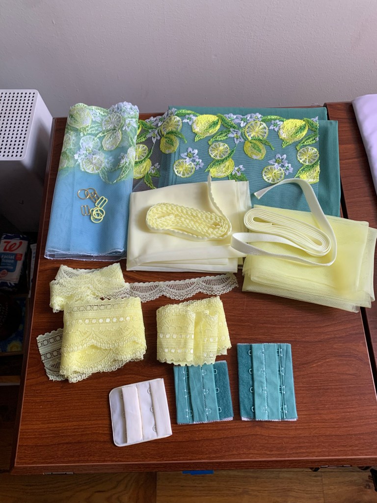 Another year where I’m really pleased with everything in the box. I asked for a few different things this year, and the contents of the box definitely reflect that, but there is still a lot to have fun with. There are three distinct color groupings: the first is a teal/purple/cream with lots of elastics for both bras and underwear and a floral lace that ties all the colors together. The second is a blue color-way with a mix of light blue and navy fabrics and trim that will be a bralette and underwear set. Finally there is the burgundy and grey color story which ties together with the bamboo print.