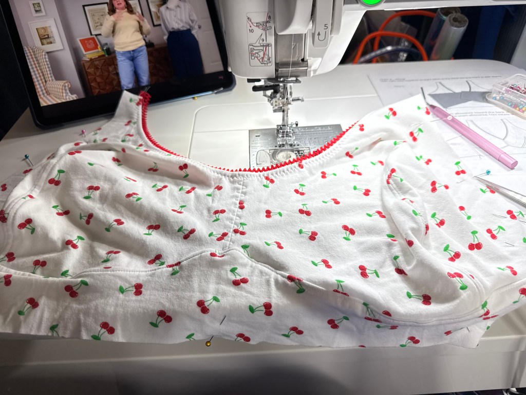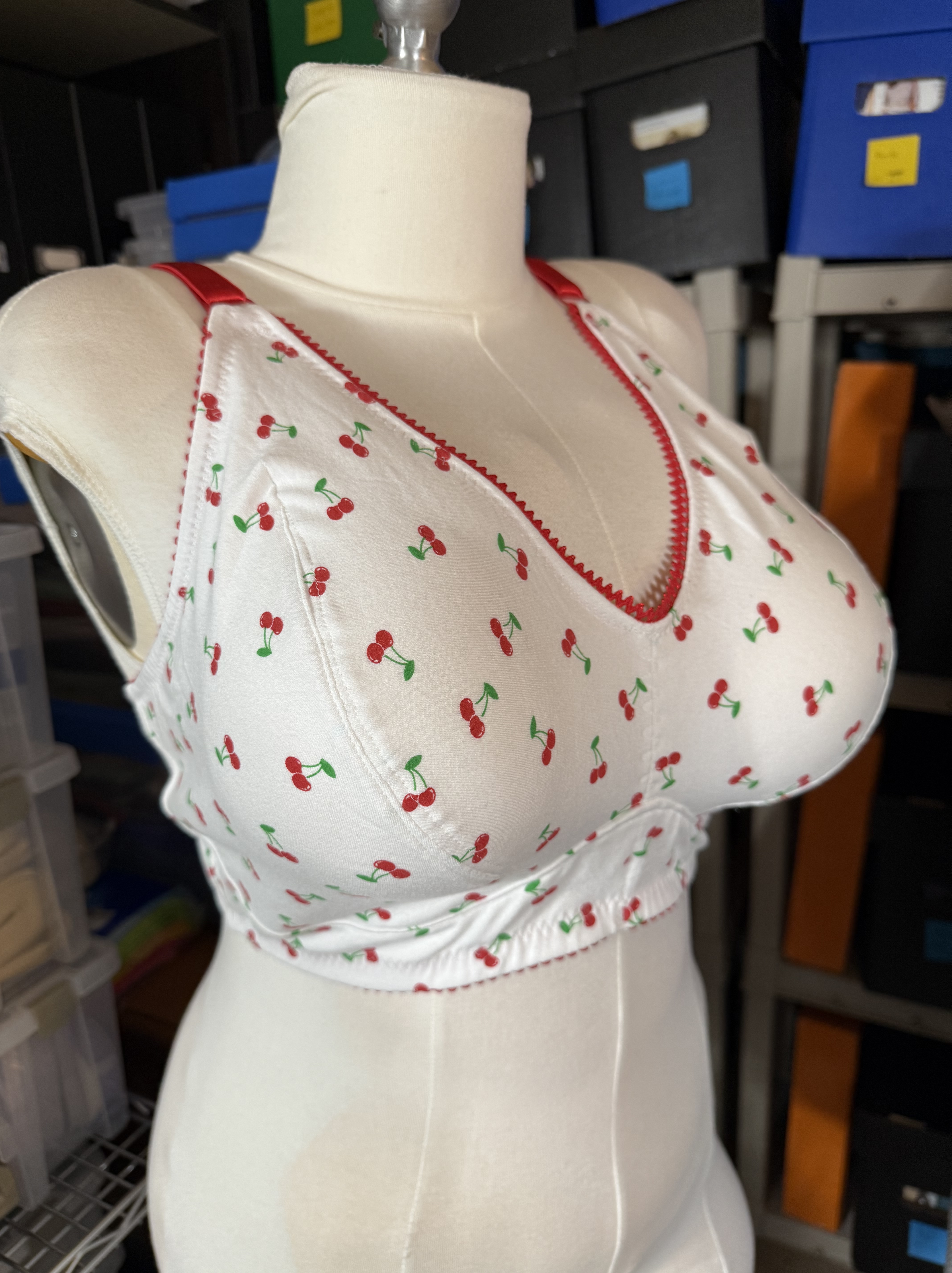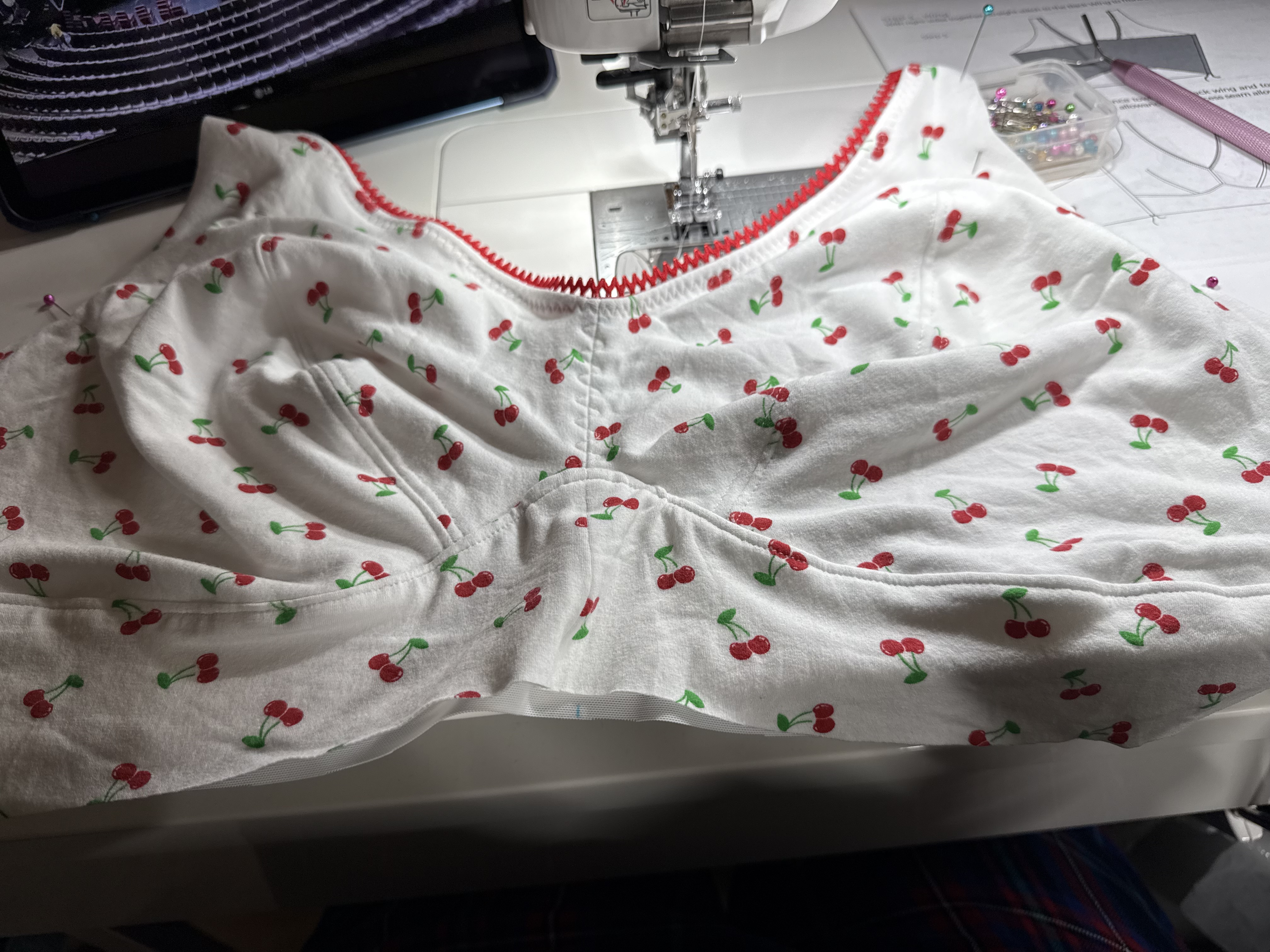 This pattern is relatively quick to put together (of course, I made it as fussy as possible by double layering the cotton jersey with powernet, and nesting or enclosing all the seams before top stitching), so although I lost several hours of work and had to start over, I was still able to get it done in a day. My topstitching on the front dart is a bit puckery (which is soooo annoying because the first time I made the cups they were perfect!), but my that point I was kind of over it. The rest of the bralette came together easily though and I have a cute new cherry bralette!