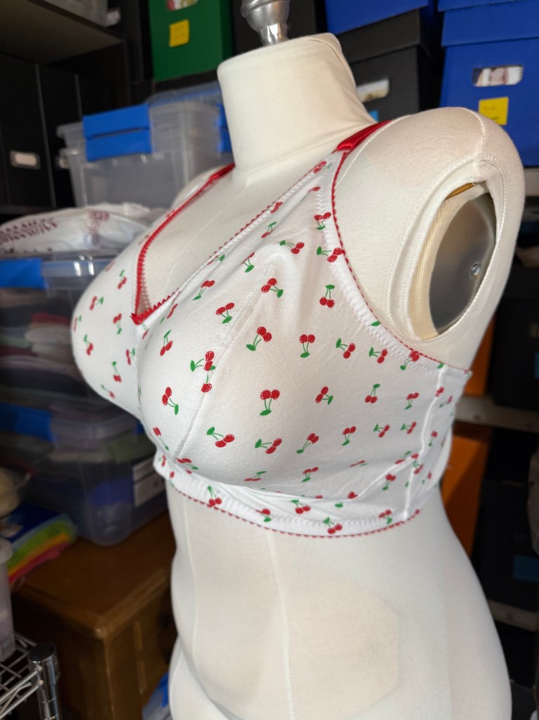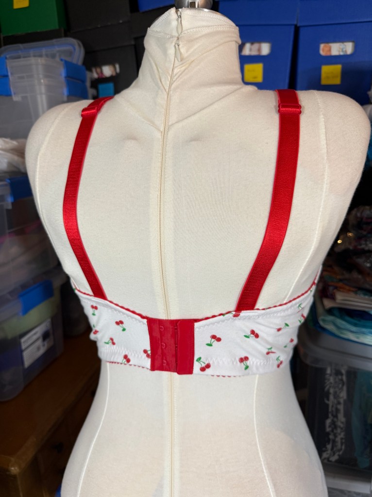 My previous versions of the Mysa I used a size 6.5″ BCD from the largest size packet, but this time I started with a 5.7″ BCD from the middle size packet. I need a 36 Band, but the smallest size band for the 5.7 BCD was a size 48, so I compared the total band length between the new 5.7 BCD pattern and my previously adjusted 6.5 BCD pattern and took out a lot from the back band; over an inch at least. I also thought I was done with the cherry fabric, but I had a bit leftover and it seemed worthwhile to use it on this fitting experiment.