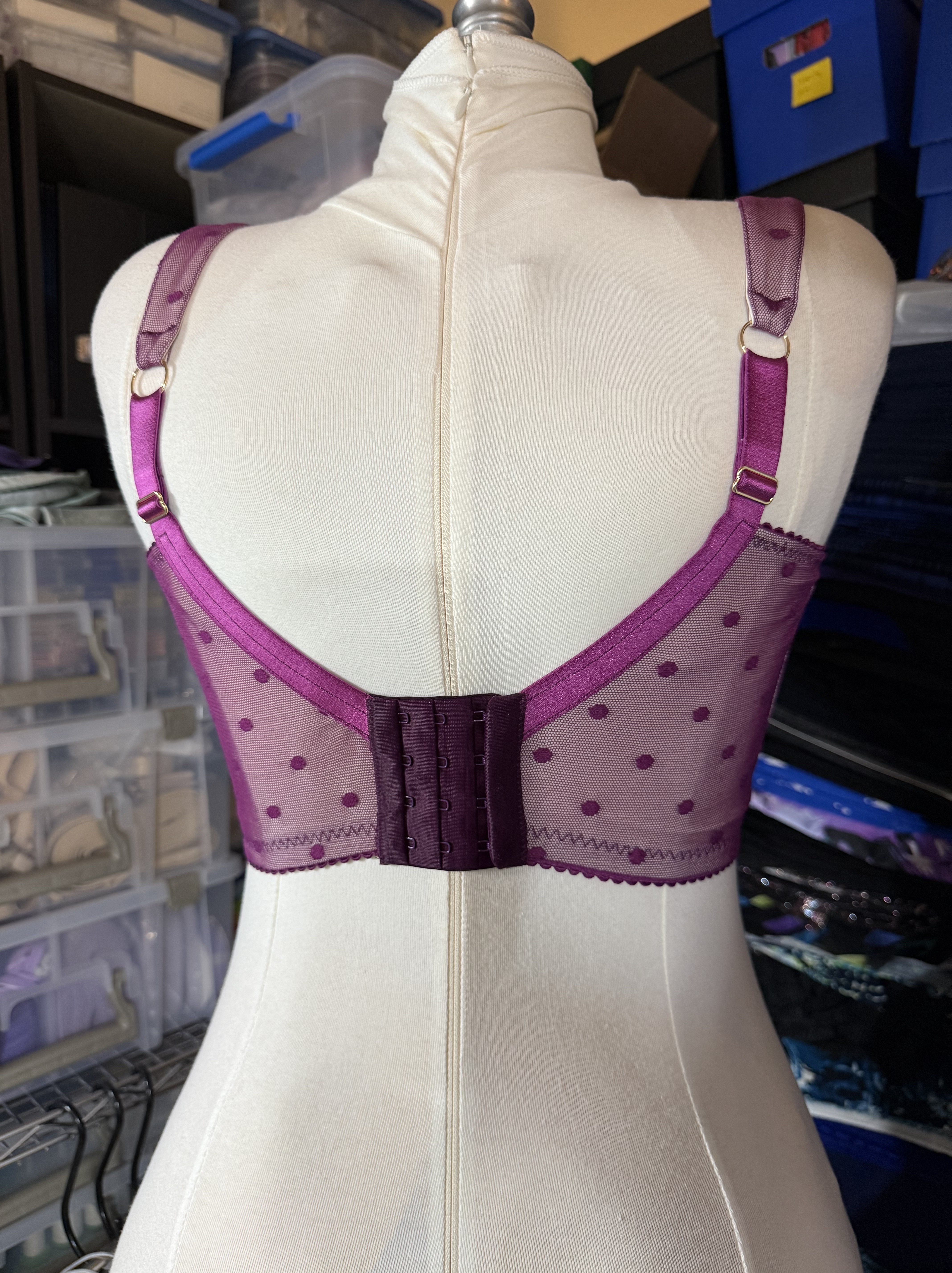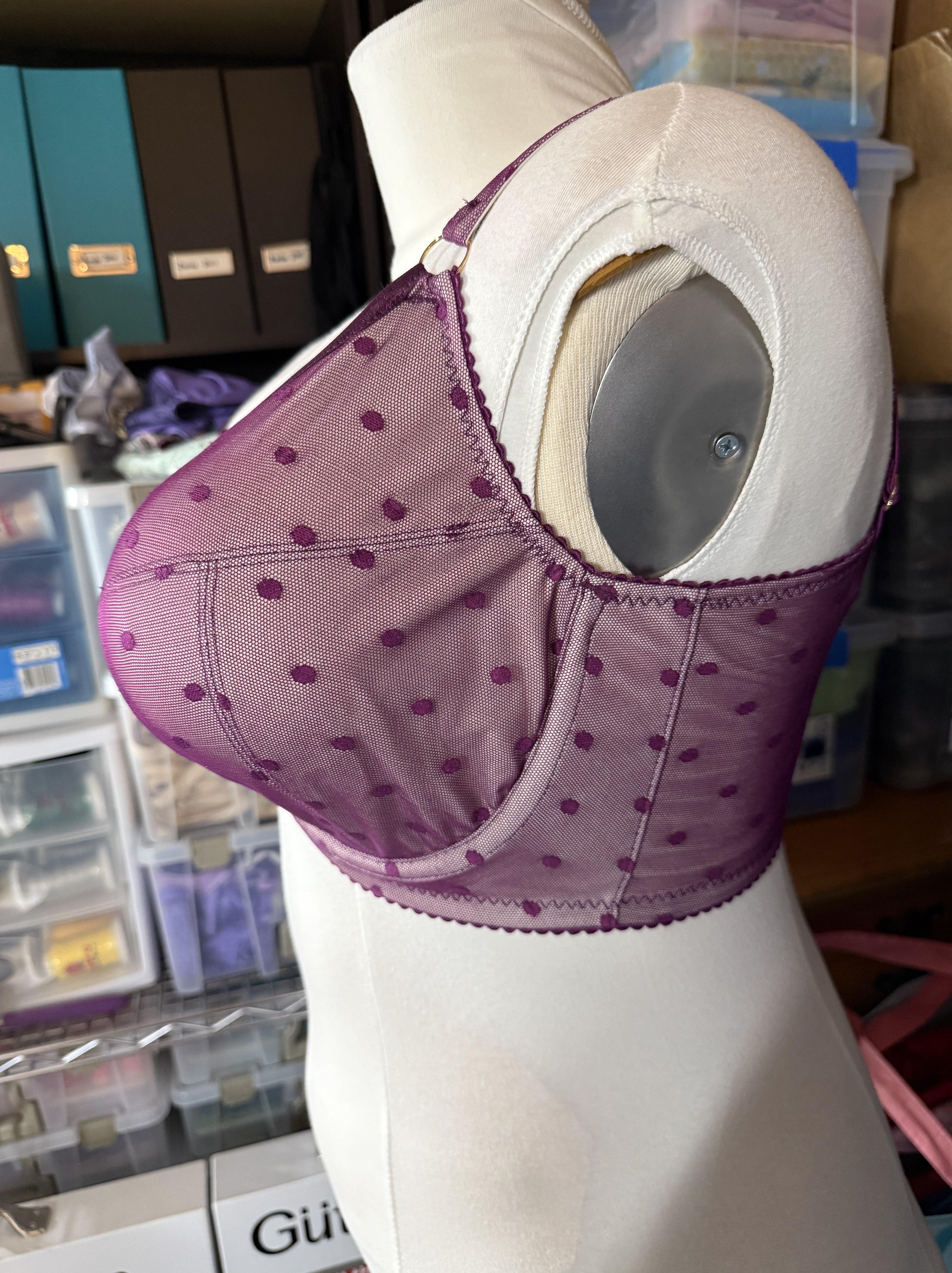 Fabric used: For my most recent version I used microdupolex with a dot mesh overlay, powernet for the back band, and the usual elastics and findings. The materials were from Bra Builders, except for the wires which I purchased from Gigi’s Bra Supply. I used a 46 Super Long wire, which was the correct length for the wire line but felt a bit wide on me. Next time I will probably try a 46 Long Vertical from Porcelynne and cut down the wires to match the pattern.