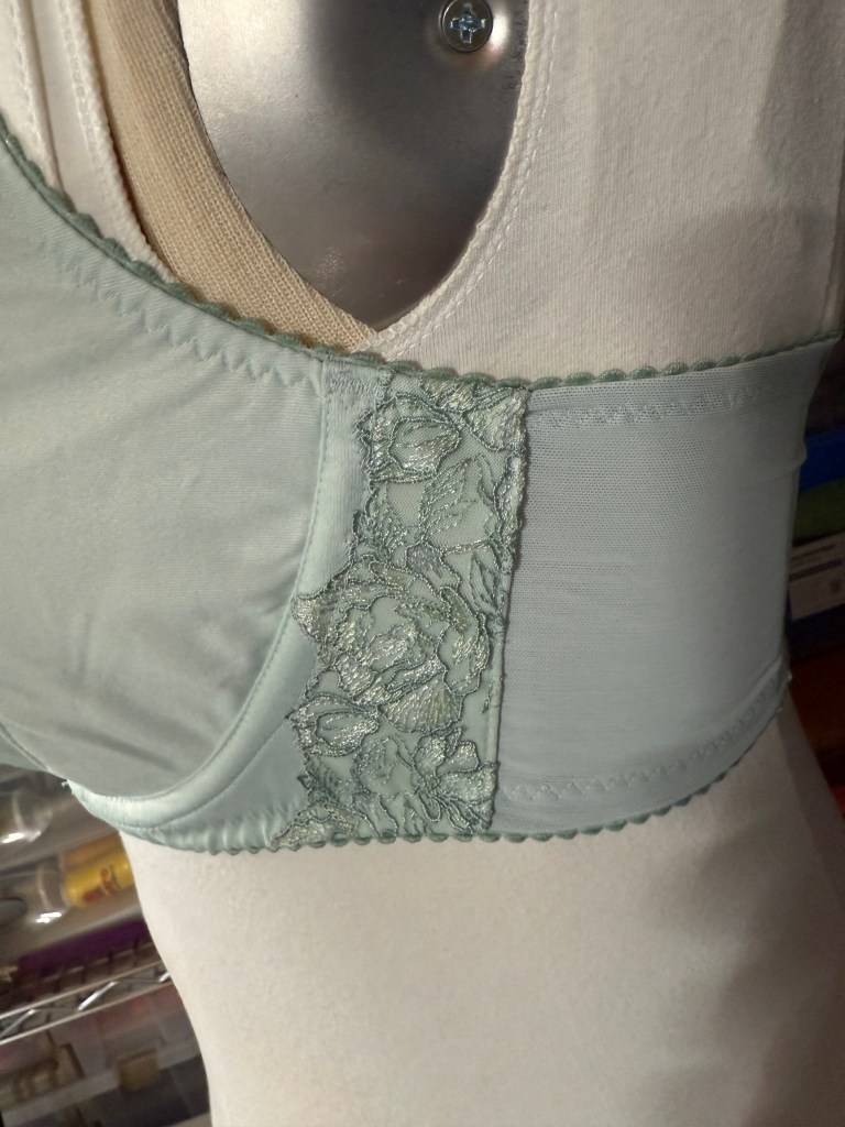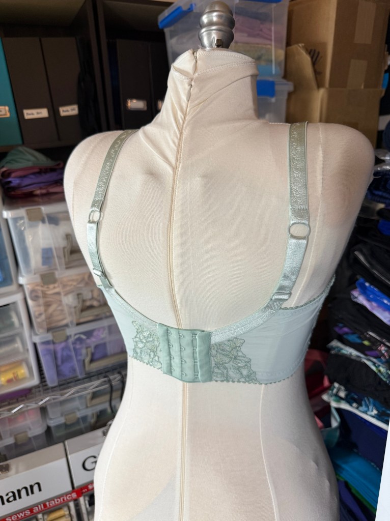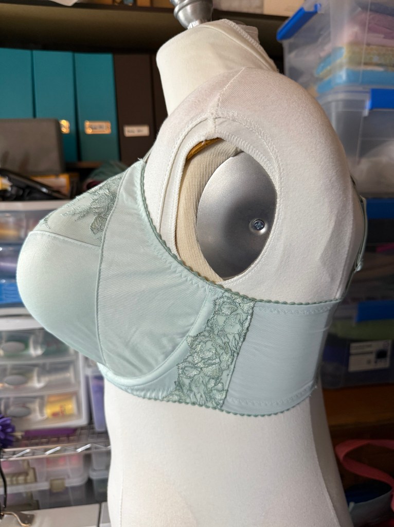 Pattern alterations or design changes you made:  For the Bee on a Wire class I started with a size 50 cup and frame, and 36 back band. I didn’t have to do too many alterations once I found the right starting size. I took a 1/8” dart out of the upper neckline, a 1/4” curved dart out of the power bar, and applied the “magic band” (IYKYK) edit that pivoted the back band upward and reduced the length of the upper band. While going through the fitting process I was using 46 vertical wires, but they ended up being too short. The Gigi’s 46 Super Long wires fit, but felt too wide, so I decided to try cutting 1” off the Porcelynne 46 Long Vertical wires, which ended up with the wire being the perfect length. I used the Porcelynne tipping material to help finish off the wire edge so it doesn’t poke or tear up the fabric. In terms of style changes, I changed the back from using G-hooks to attach the straps and give cross-strap options into a standard ballet back design and increased the hook to a 4-high instead of a 3-high based on the materials I had in my kit. I also stabilized the upper strap with ribbon because I prefer non-stretch straps.