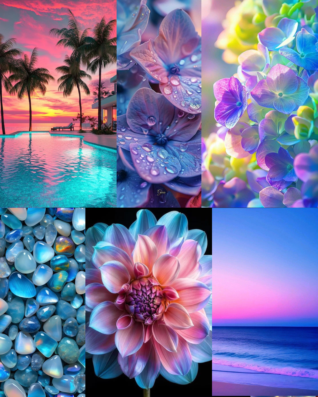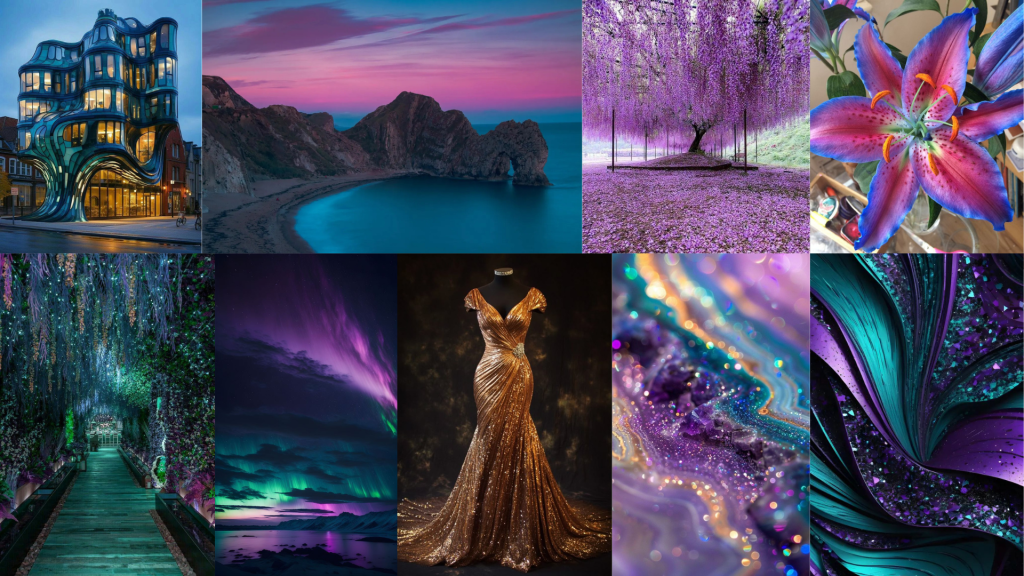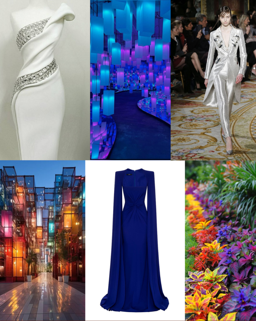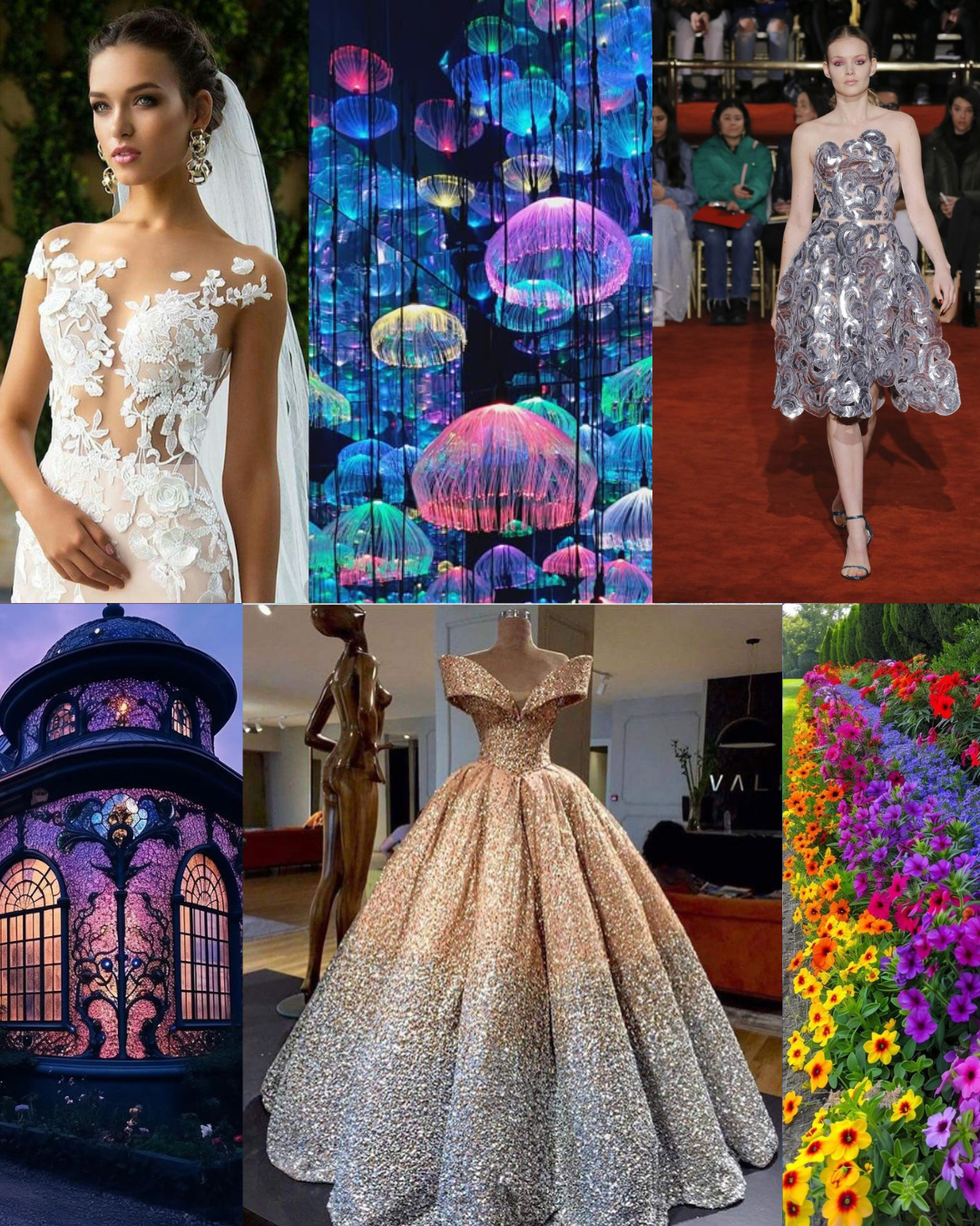 In this exercise Kibbe has you create a collage of images that include a building, a landscape, a tree, a flower, a garden, a sky, a formal gown, and two “images that delight”. You are allowed to make substitutions for any of the images (example: changing the garden to a beach) except for the gown.