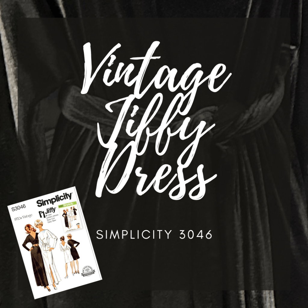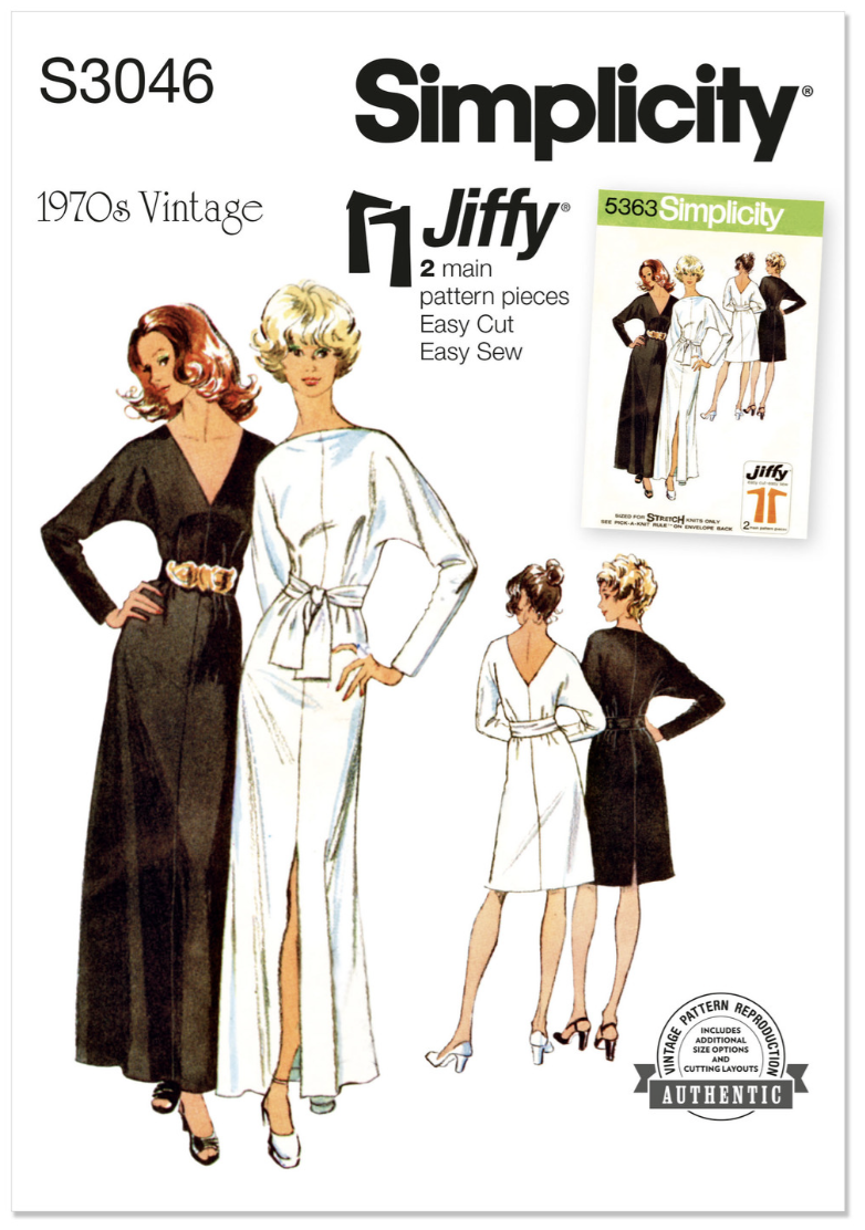 Pattern Description: A simple 1970s long sleeved dress that can be worn front to back or back to front with straight or V-neckline and two hem lengths. From the Simplicity website: “Vintage Simplicity 1970’s Jiffy knit dress in two lengths and sash sewing pattern. The short or long dress with long kimono sleeves has high straight neckline and slit in front, V-shaped neckline in back and self-fabric sash or purchased belt slipped thru thread carriers. Dress may be worn with a V-shaped neckline in the front. Short dress is regular length. Long dress is ankle length. Authentic Vintage Reproduction includes additional sizes and cutting layouts.”