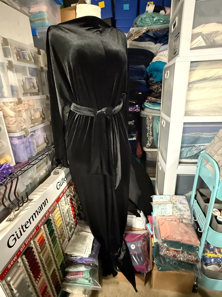Would you sew this again? Would you recommend it to others? I’m not sure if I will sew this again. I still love this dress in theory, but I think because it didn’t fit well around the neck I realized I wasn’t going to be comfortable wearing it to an event and sort of got into a state of being “over it” and didn’t do my best work to finish off the hems, which hasn’t helped. I still think it looks simple and glamorous in the drawing, but on me it just sort of feels like wearing a very boring robe. I suppose it might be a case of using accessories to make it shine, but between the fit issues and the overall feeling of “blah” I get when I put it on, I’m not sure how motivated I will be to fix it or work to make a better version.