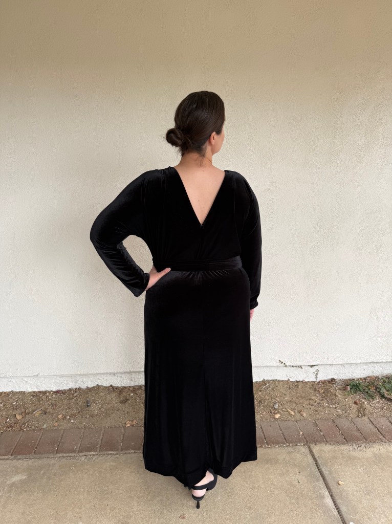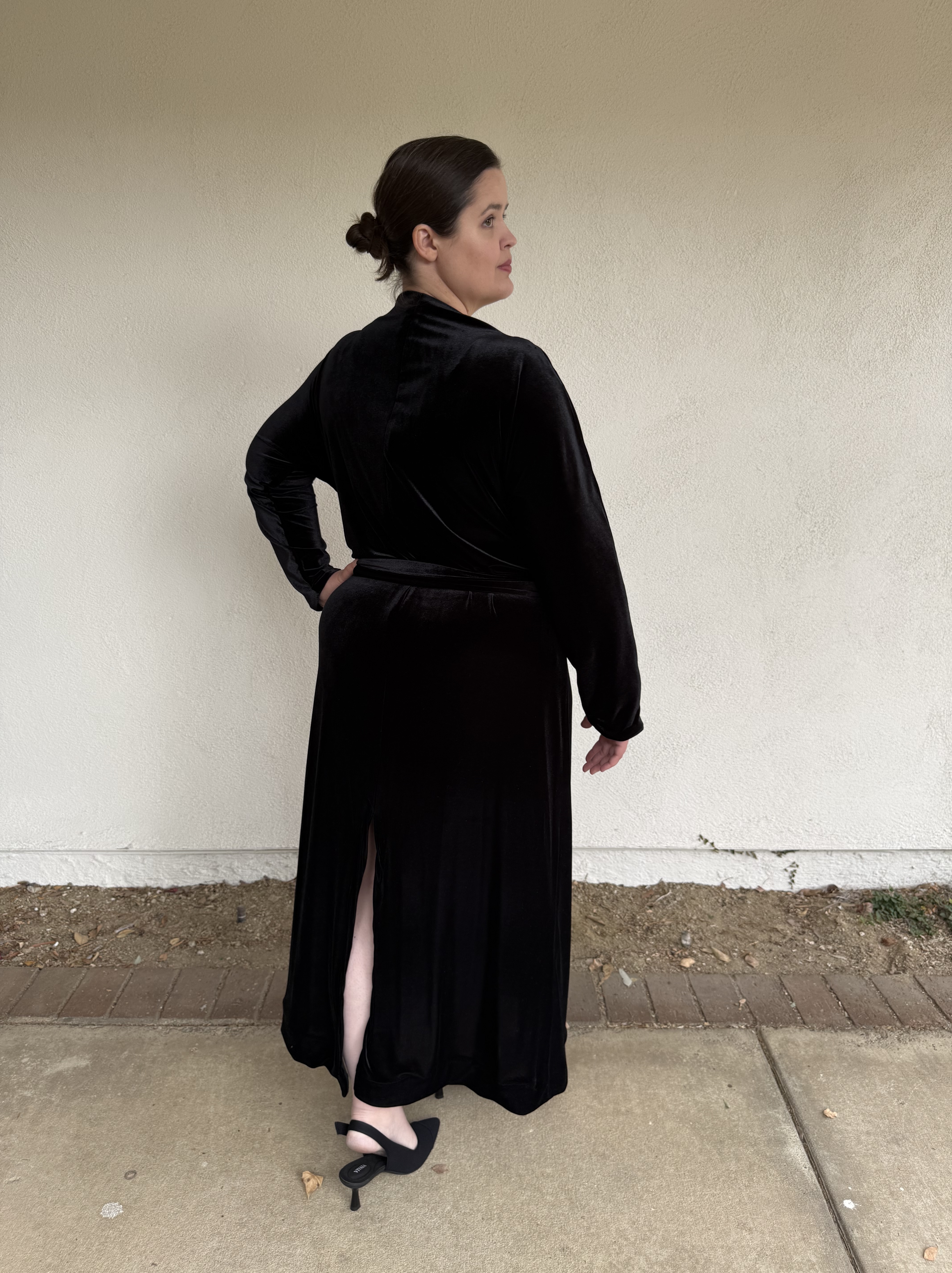 There were a lot of things I liked about this pattern that made me think I could achieve it in a few short weeks: it looked simple, there weren’t a lot of pieces, it was reversible, and it has the T-silhouette I’ve been wanting to play with a bit more. I also imagined I’d be understated and elegant, and that I could have a lot of fun accessorizing such a gown. I decided to make it in a black stretch velvet from Cali Fabrics, and because the pattern measurements seemed pretty reasonable, I dove right into making the dress without doing a mock up. This, as we shall see, was a mistake.