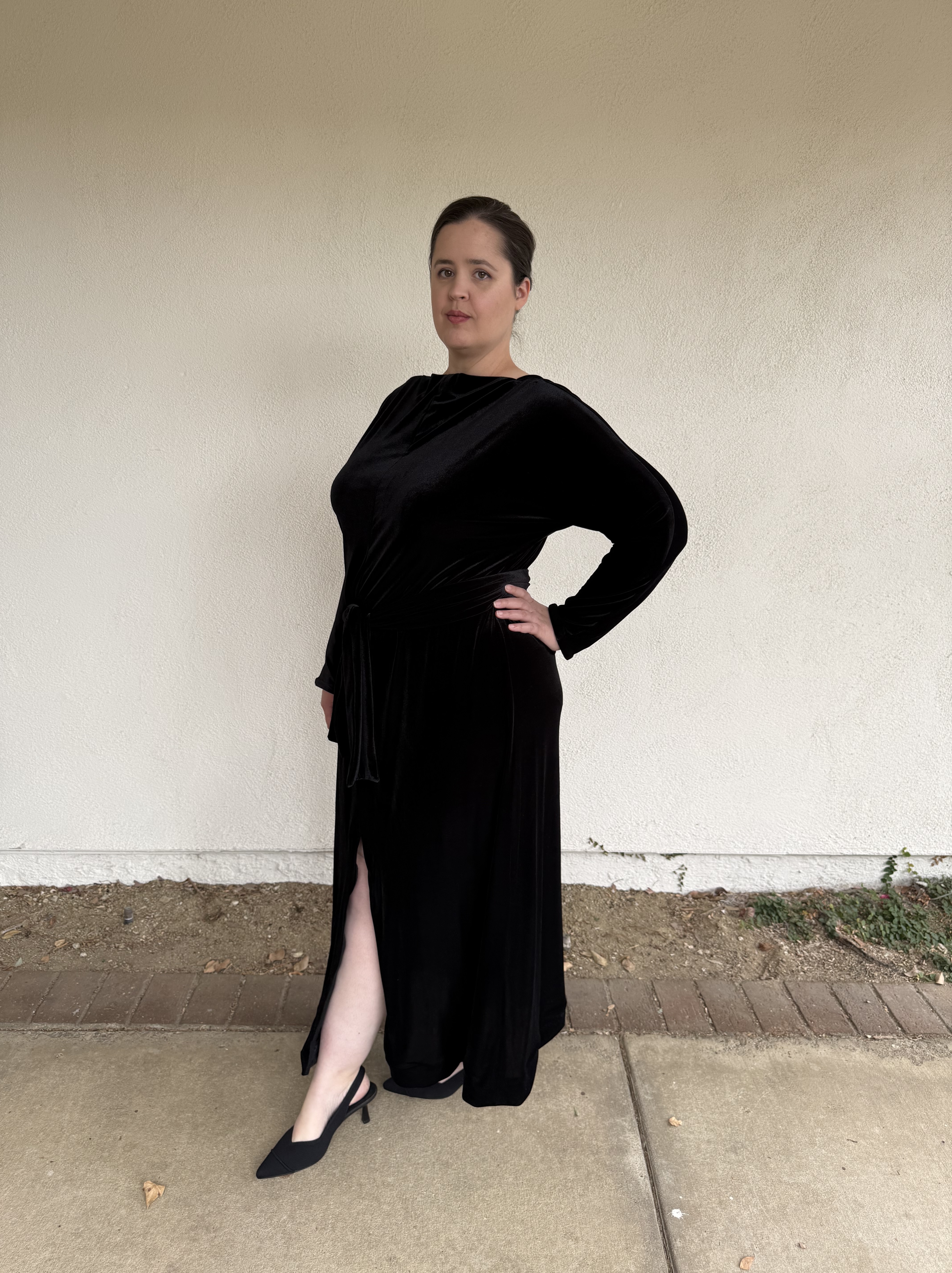 I sewed this dress back in October, but it’s taken me a while to get around to blogging about it. Black fabric is notoriously difficult to photograph, and if I”m being honest, this didn’t end up being a favorite project of mine, so the desire to show it off was also quite subdued. But I do want to try and get everything I’ve made this year on the blog before we roll into 2026, so here we go.