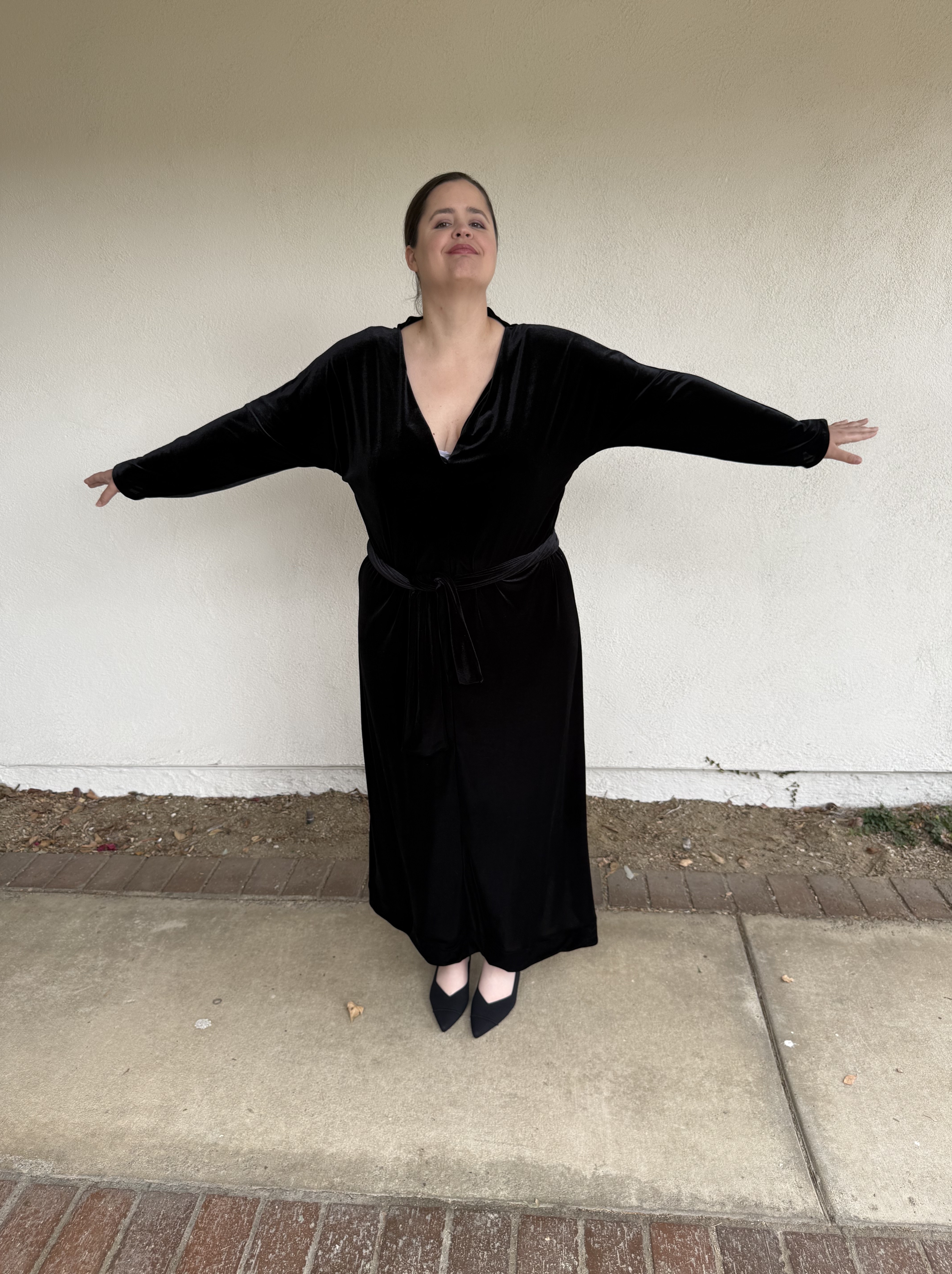 In the meantime, I suppose I could swan around the house in it and live up my villain era. At least as long as I run around with my arms out to keep it from falling off of my shoulders…