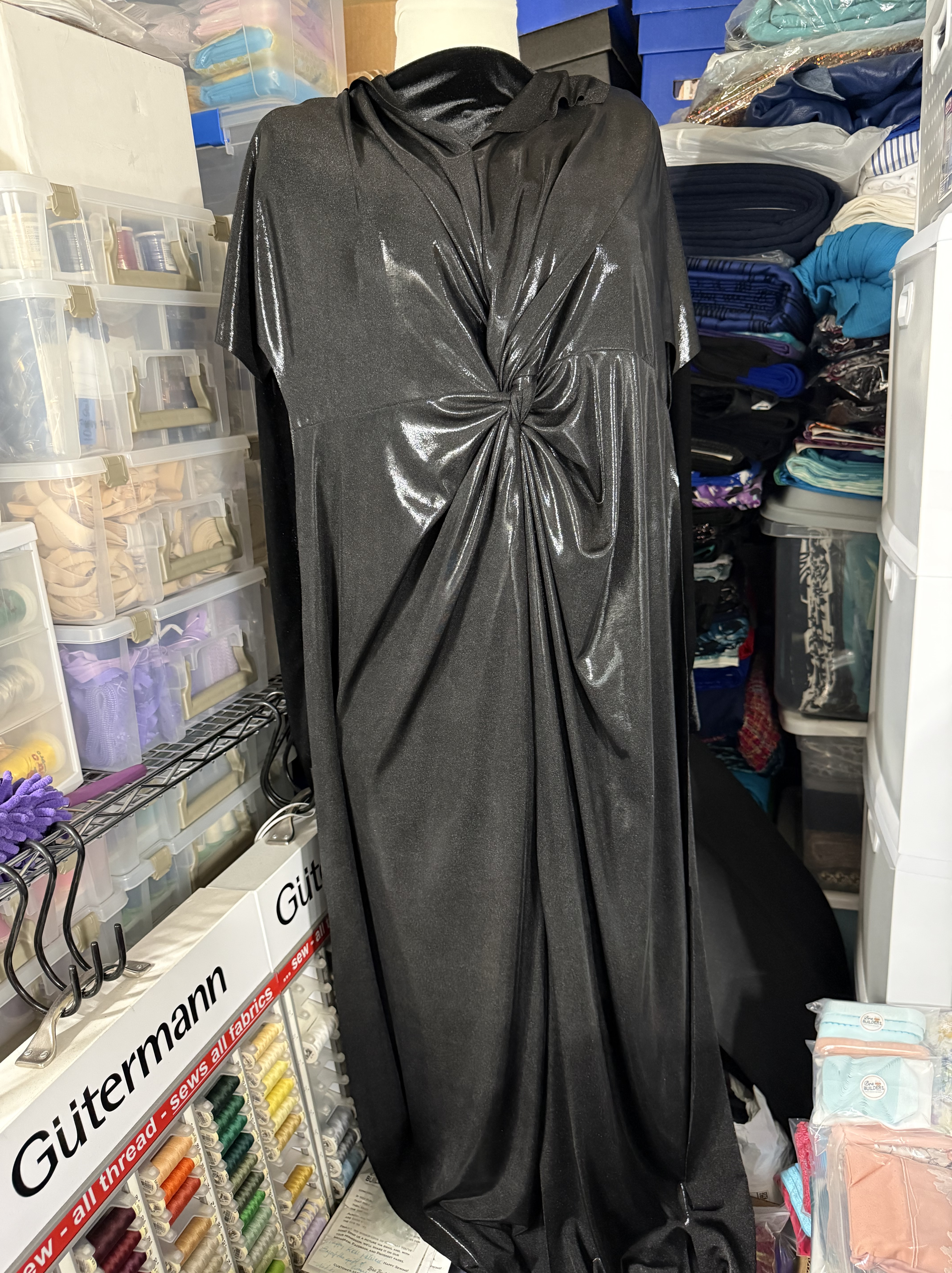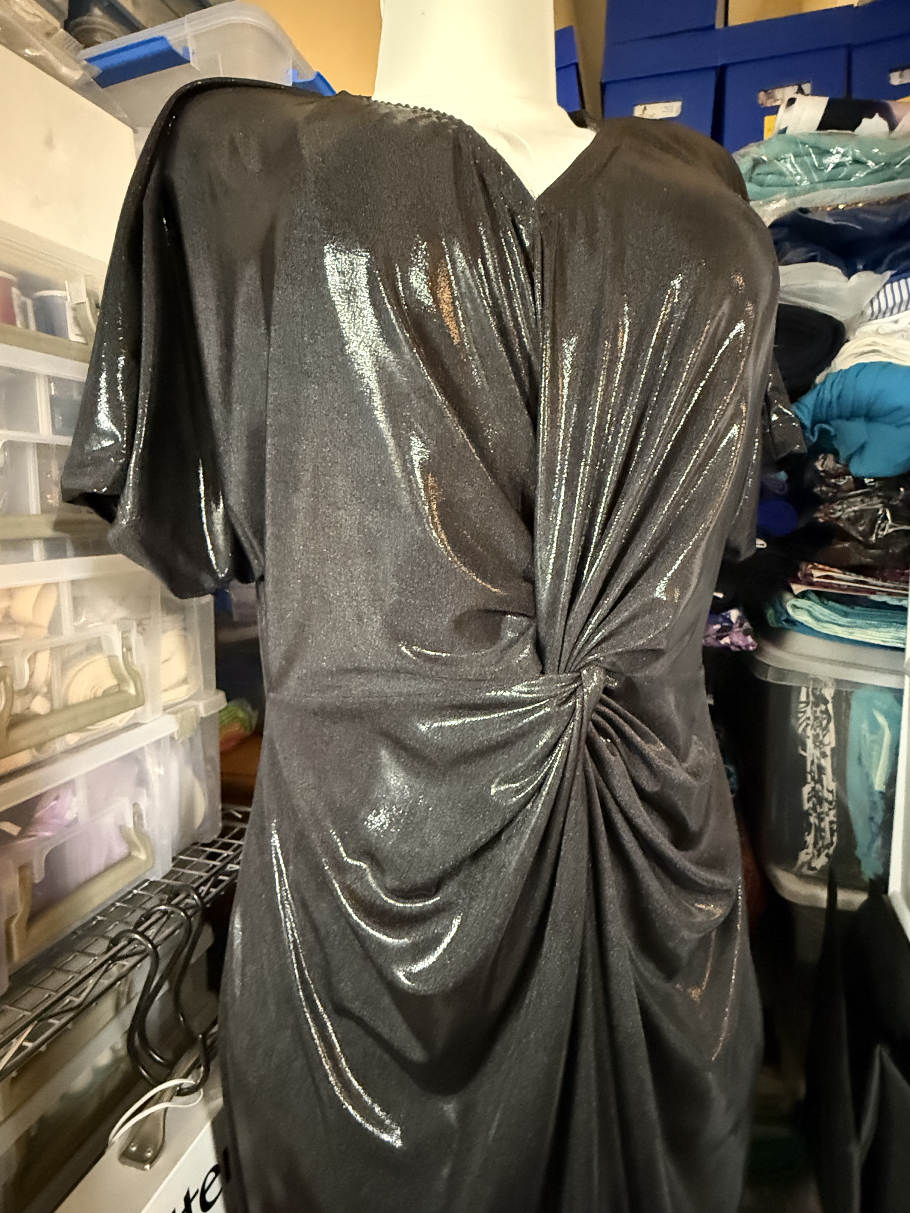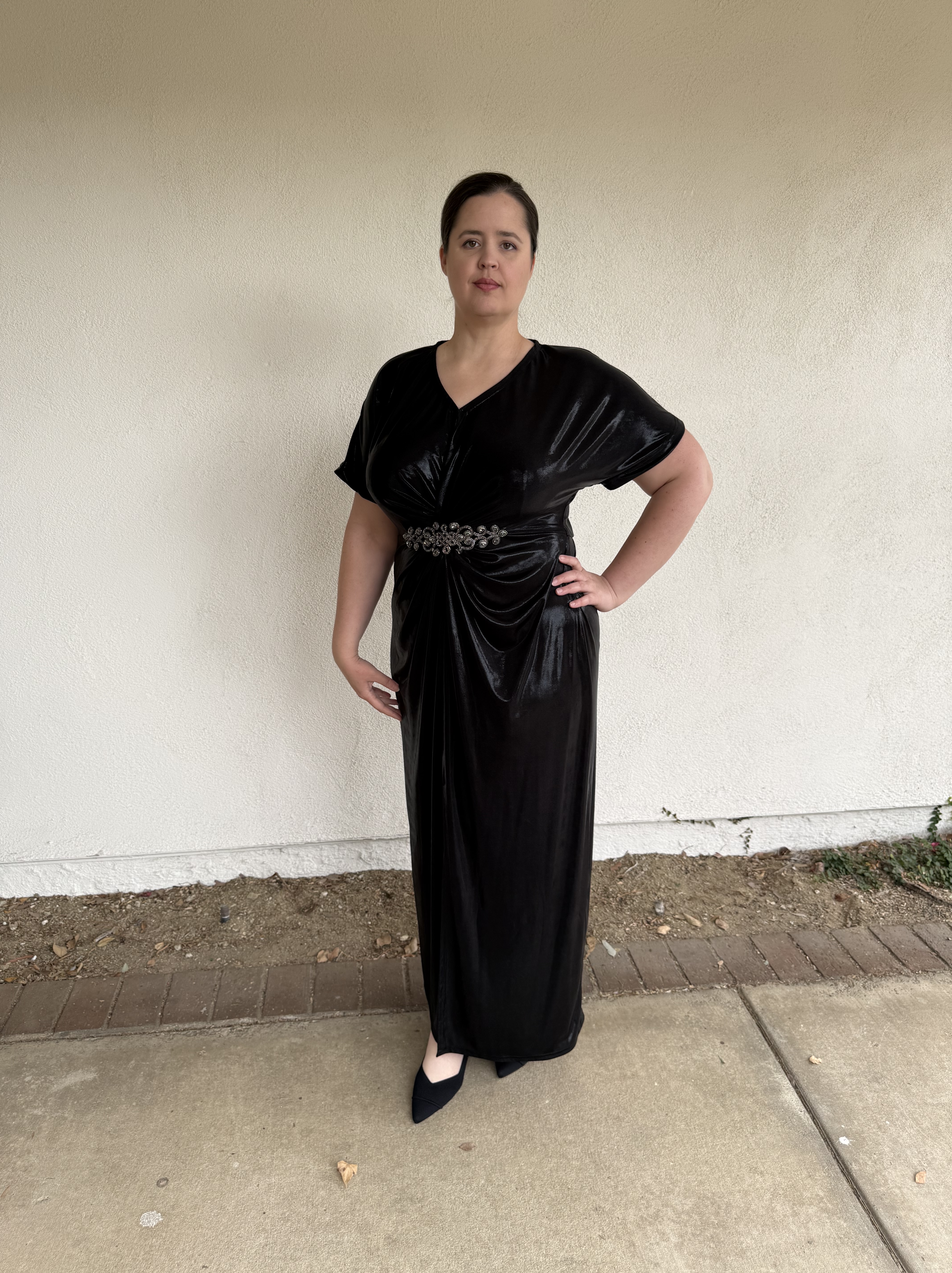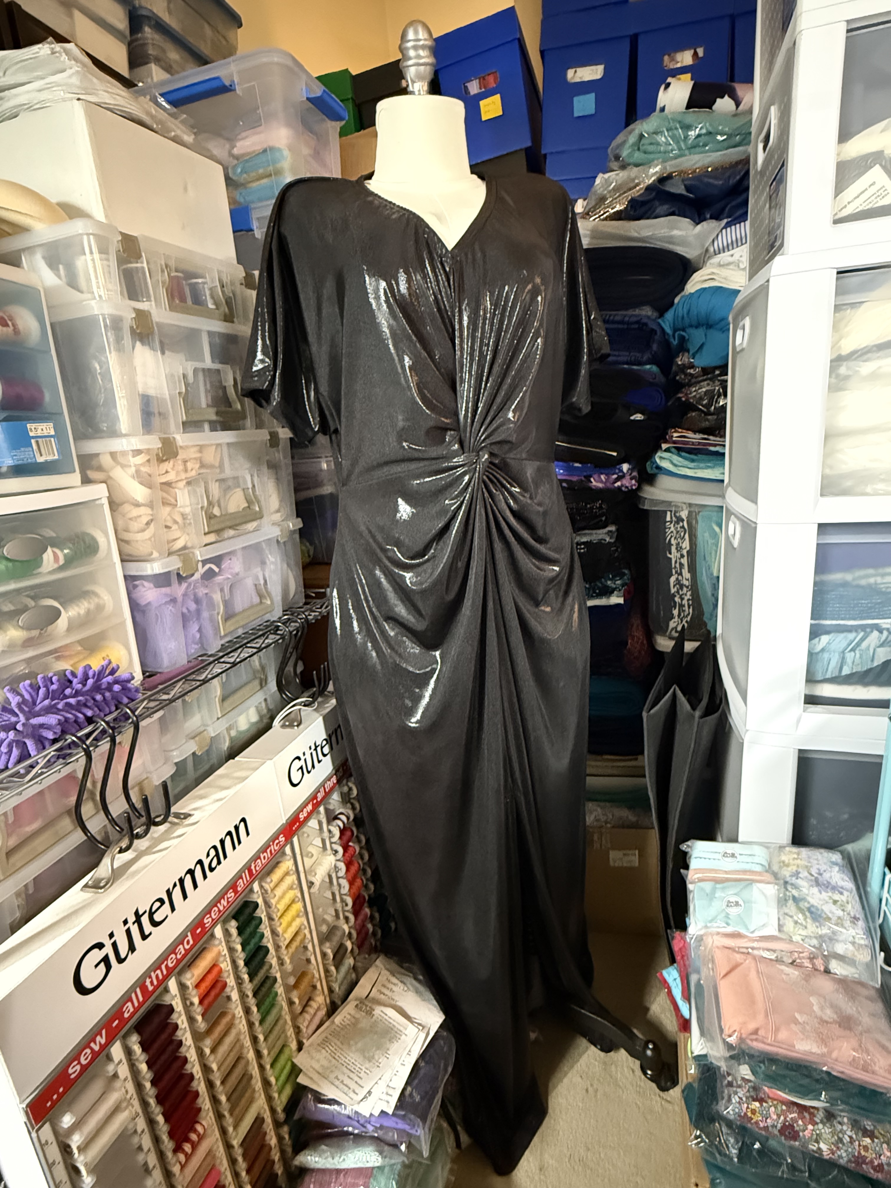 Originally I was planning to use a different fabric, but I wanted to test the full length version first before cutting into my expensive fabric, so I decided to cut into a cheaper metallic slinky knit first. I snagged it on sale from FabricMart for something like $4 a yard, which is a steal. I do have to admit I kind of wonder if it looks like I’m wearing a trash bag, but I decided I was just going to own it if I did. And even if it does look like a trash bag, but it’s a fabulous trash bag, so it’s fine. Things being what they’ve been this year, I ran out of time and the expensive fabric is still safely living it’s life as potential future clothes, but I’m going to pull it out at some point because it’s gorgeous and I love it and I think it needs to become this dress anyway. But, for the time being, fabulous trashbag it was.