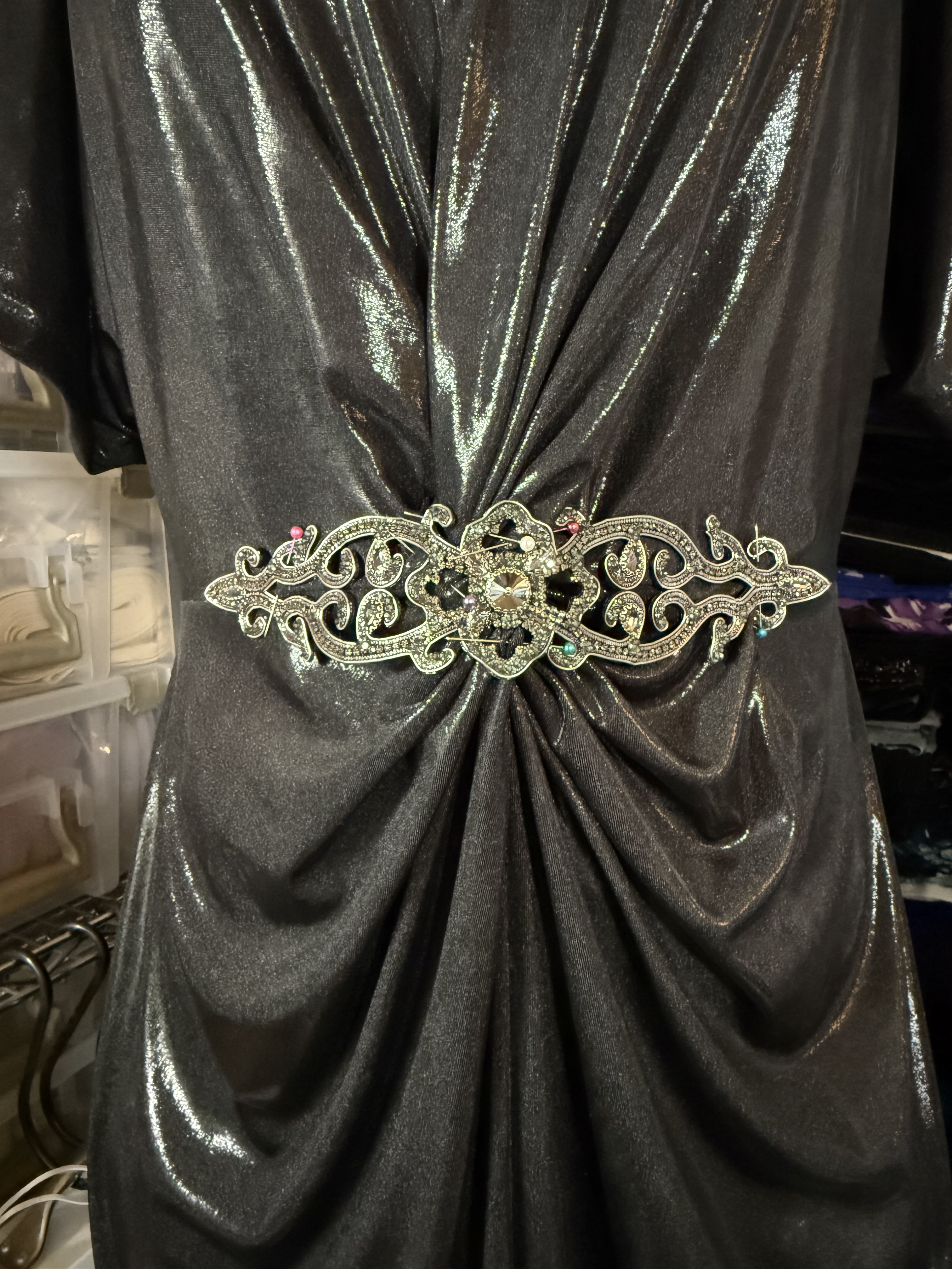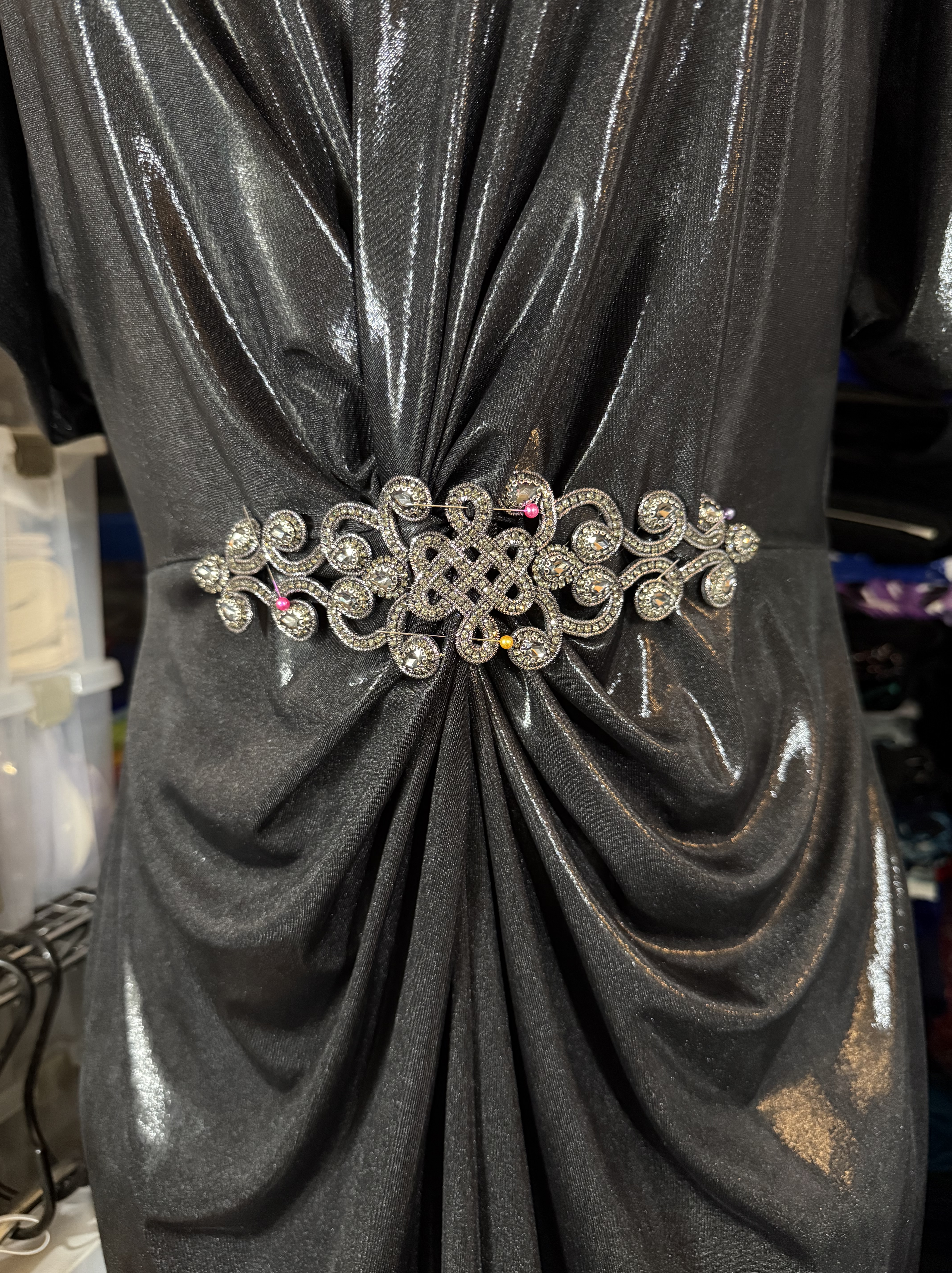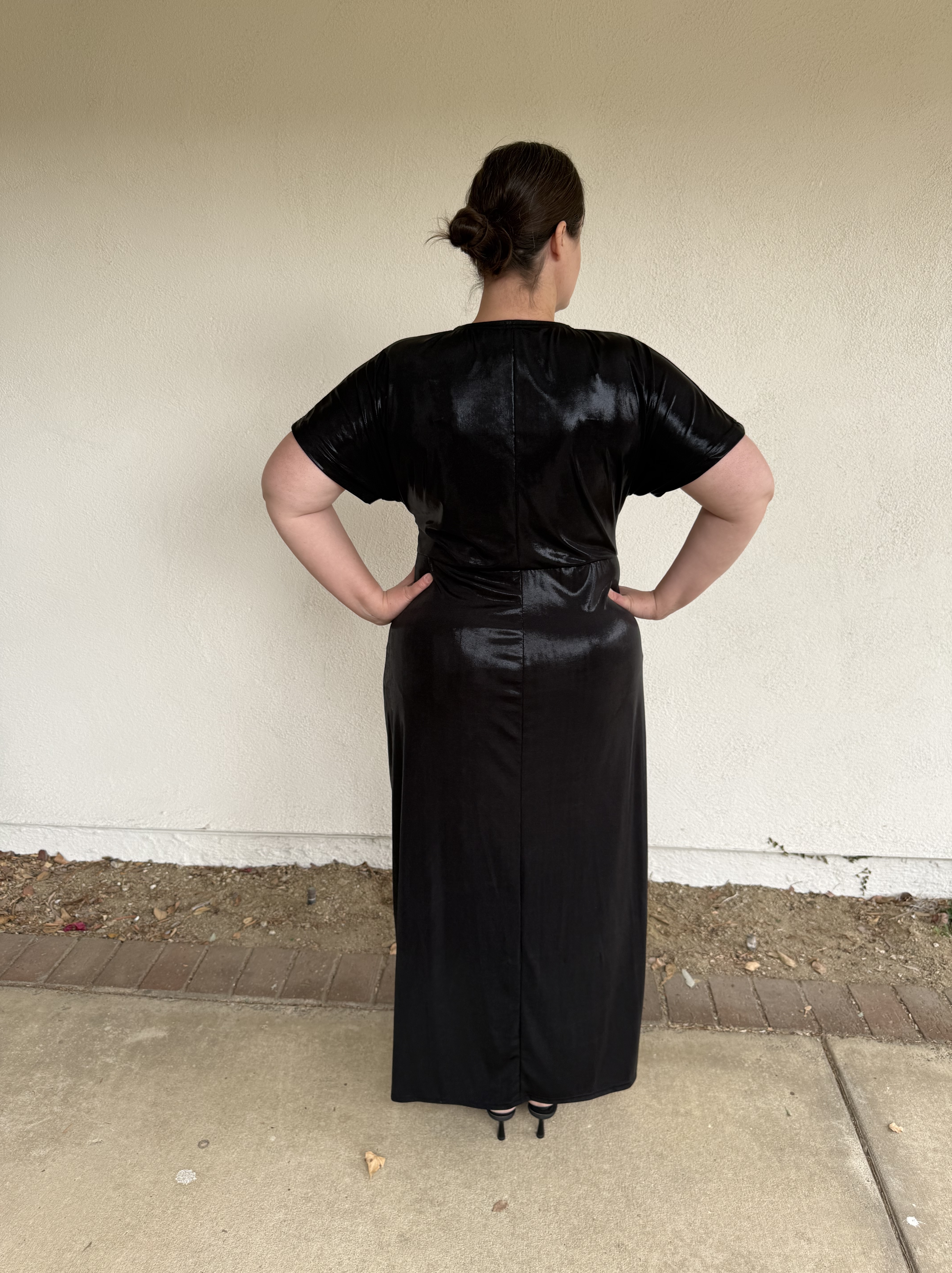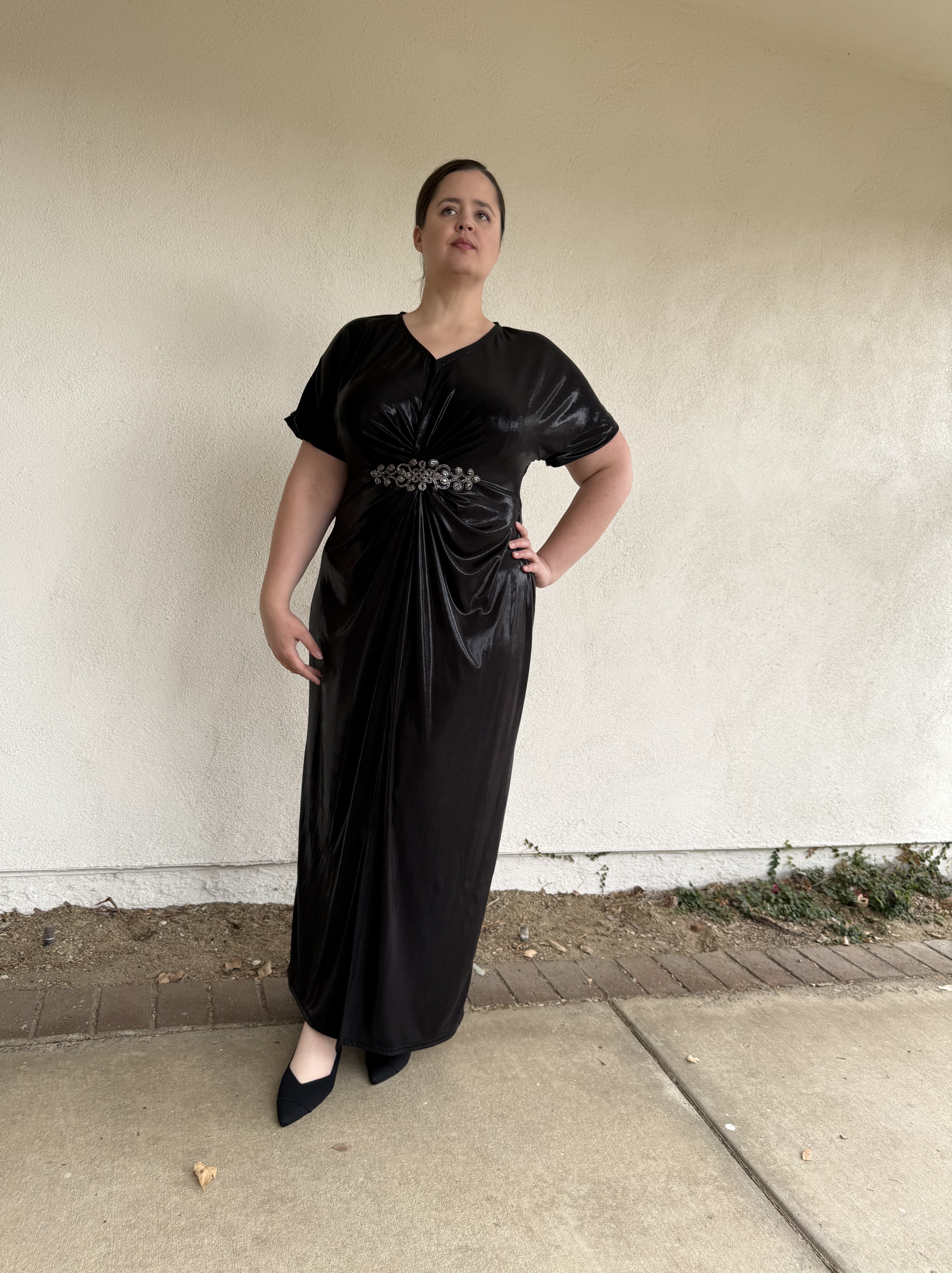 Originally I was planning to use a different fabric, but I wanted to test the full length version first before cutting into my expensive fabric, so I decided to cut into a cheaper metallic slinky knit first. I snagged it on sale from FabricMart for something like $4 a yard, which is a steal. I do have to admit I kind of wonder if it looks like I’m wearing a trash bag, but I decided I was just going to own it if I did. And even if it does look like a trash bag, but it’s a fabulous trash bag, so it’s fine. Things being what they’ve been this year, I ran out of time and the expensive fabric is still safely living it’s life as potential future clothes, but I’m going to pull it out at some point because it’s gorgeous and I love it and I think it needs to become this dress anyway. But, for the time being, fabulous trashbag it was.