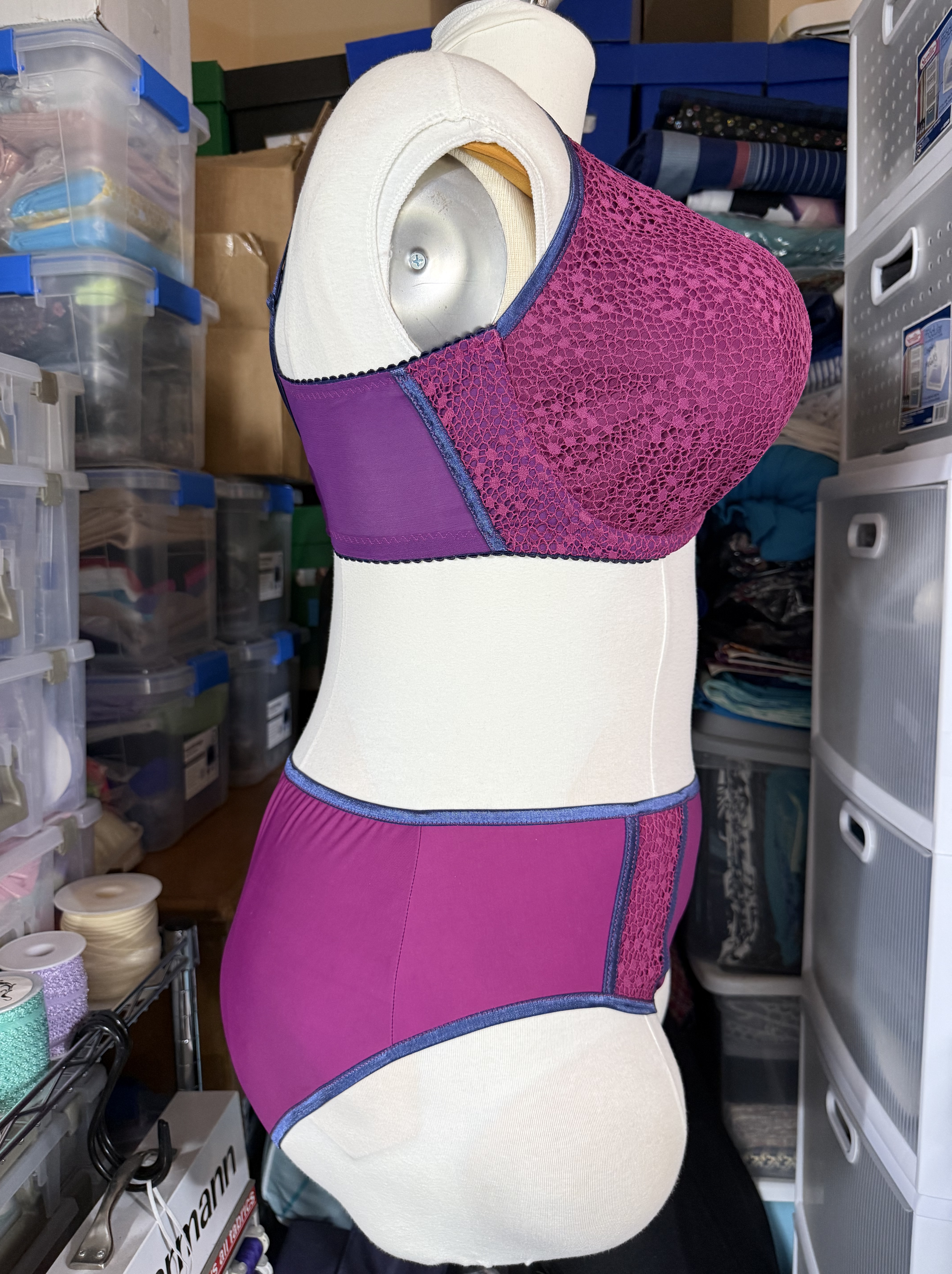 For this version I just made fabric cups, even though the pattern is really drafted for foam. I think it is easier to fit in fabric and then if that works it’s easy to switch over to foam, but I don’t always have the same results working in the opposite direction. So I did all my fittings in microduoplex, and this was my final result after popping open one of my Bra Builders kits from last year. I think it turned out really great and I love the colors!